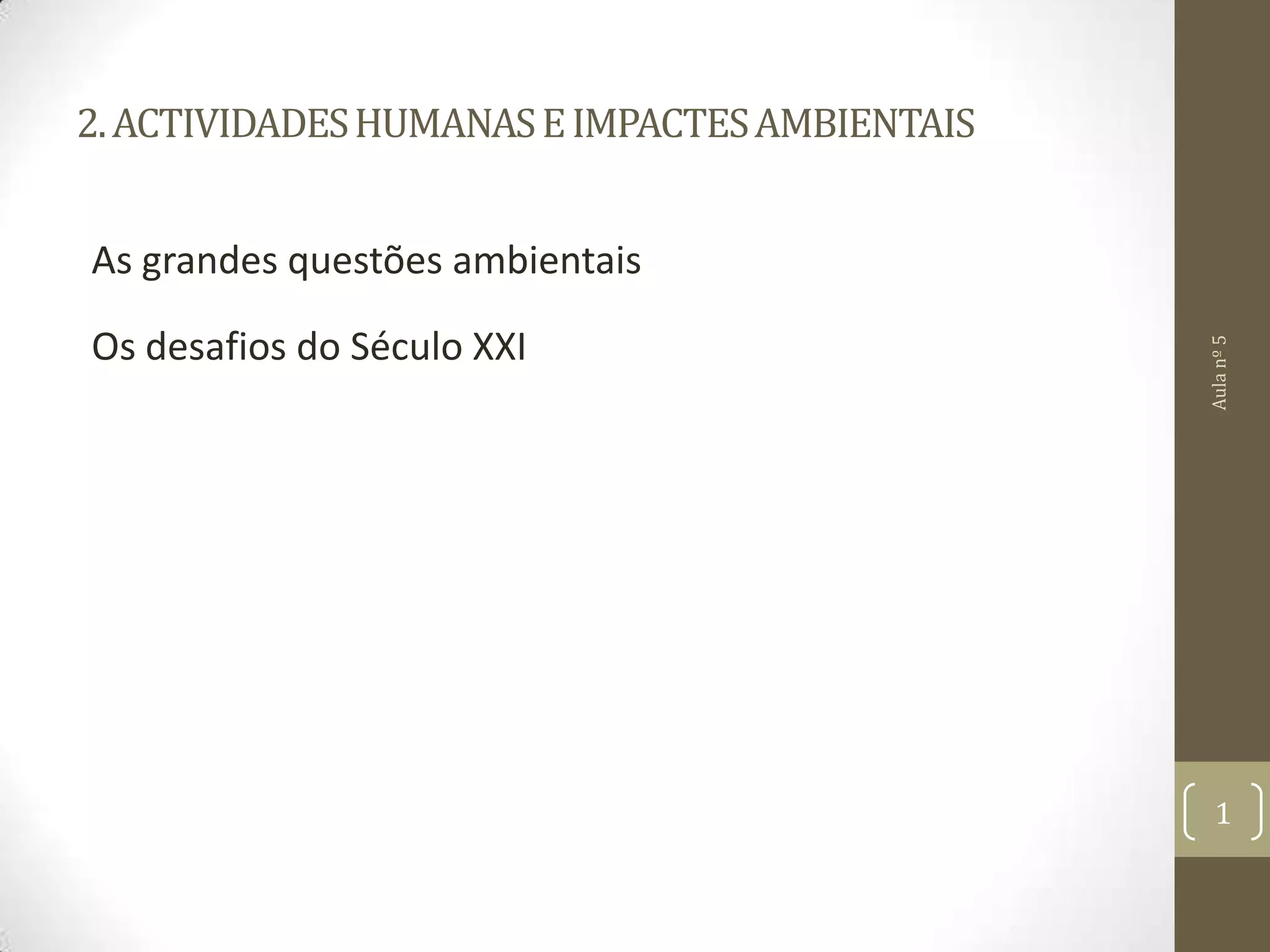 O documento discute as atividades humanas e seus impactos ambientais. Aborda como o ambiente natural é crucial para a vida e como as atividades humanas o utilizam. Também discute as principais mudanças culturais humanas e seus impactos, assim como as principais causas dos problemas ambientais globais atuais.