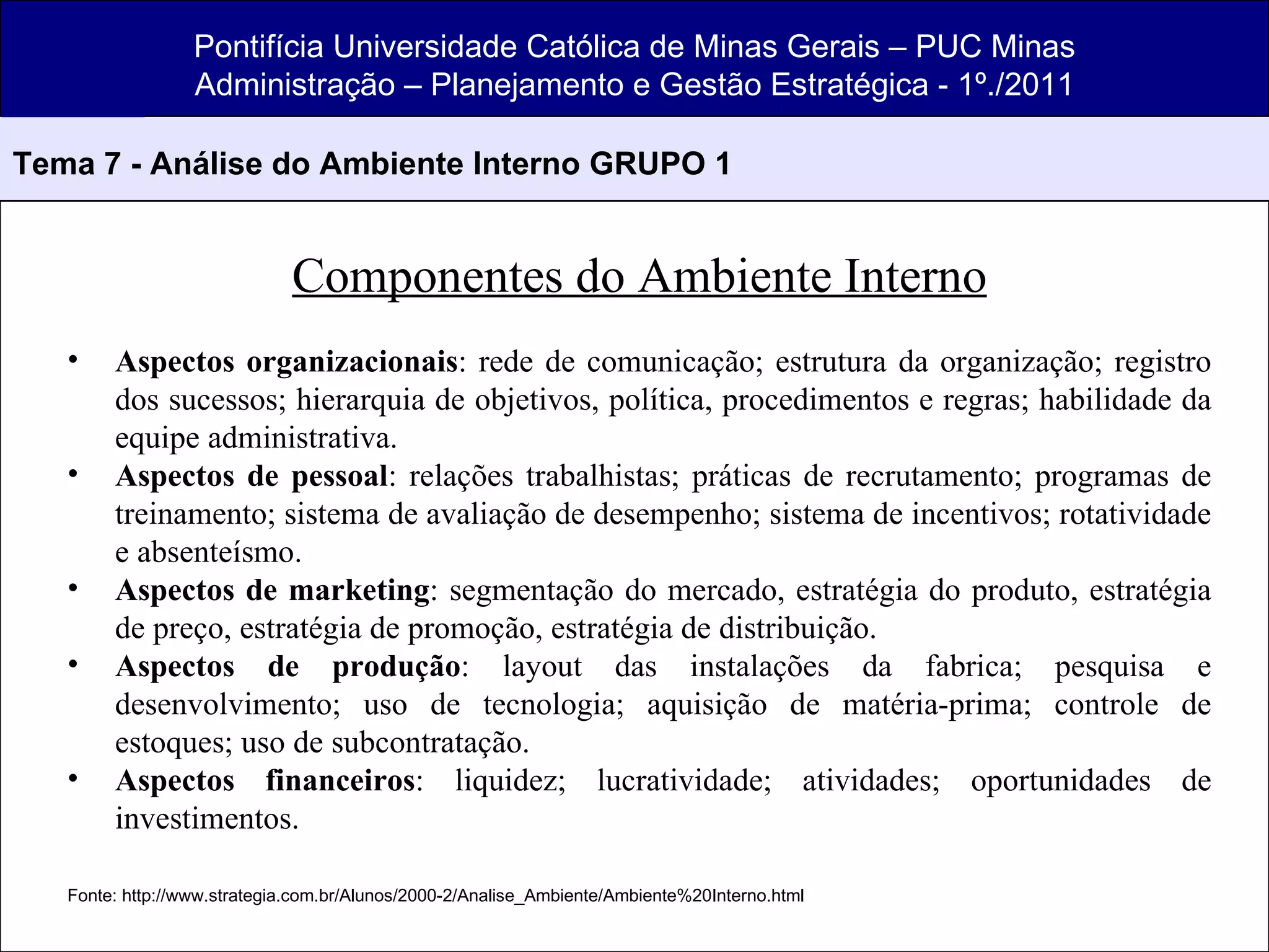 O documento discute os principais componentes do ambiente interno de uma organização, incluindo aspectos organizacionais, de pessoal, de marketing, de produção e financeiros. Ele também descreve elementos-chave para análise nas áreas de marketing, produção, recursos humanos, finanças e organização, além de problemas comuns na análise interna como falta de comunicação e baixa moral.