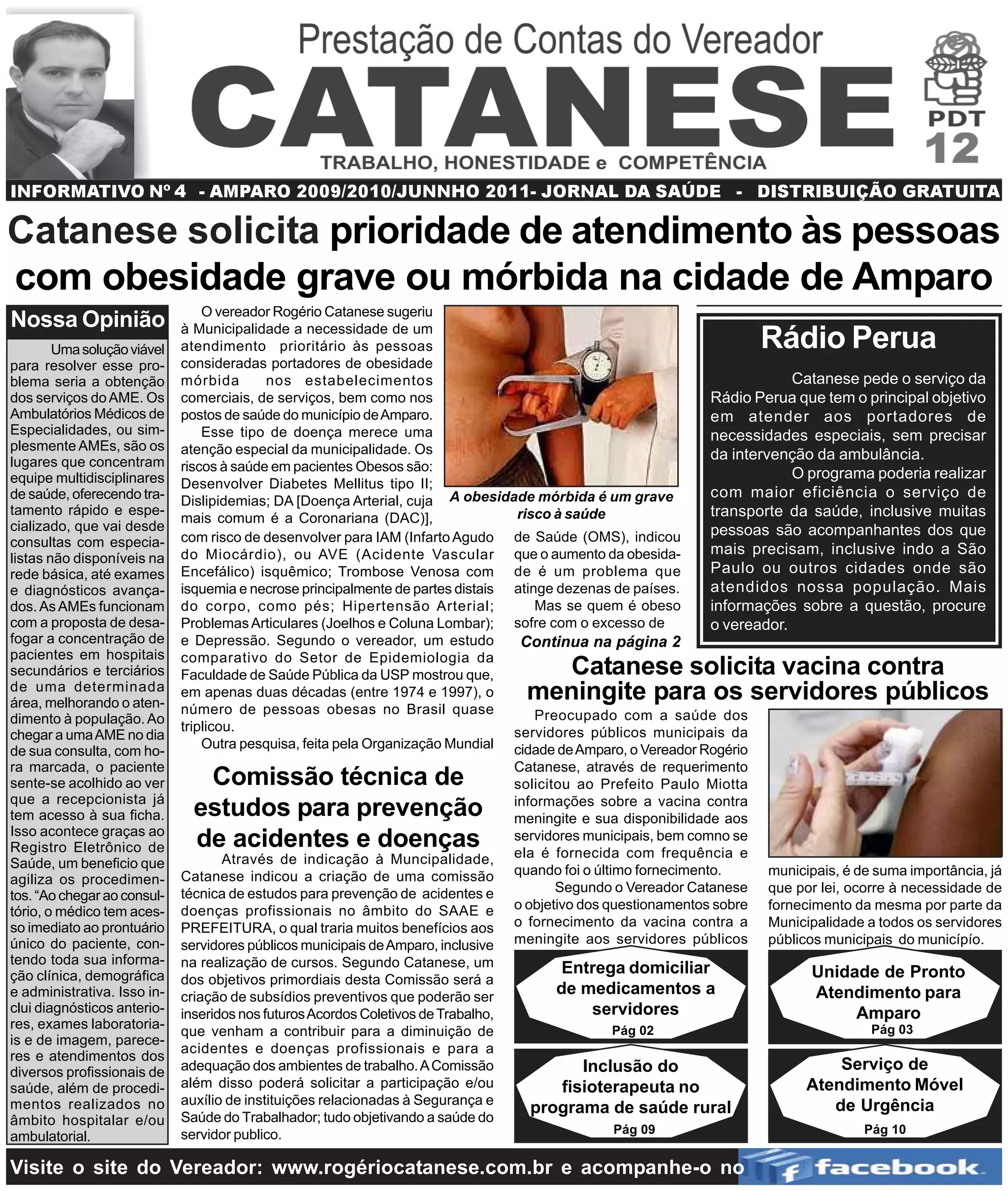 O documento discute três pontos principais: 1) O vereador Catanese solicita prioridade de atendimento para pessoas com obesidade grave nos estabelecimentos da cidade de Amparo; 2) Ele também solicita a criação de uma comissão técnica para prevenção de acidentes e doenças ocupacionais entre funcionários públicos; 3) E pede que a prefeitura forneça vacina contra meningite regularmente para servidores municipais.