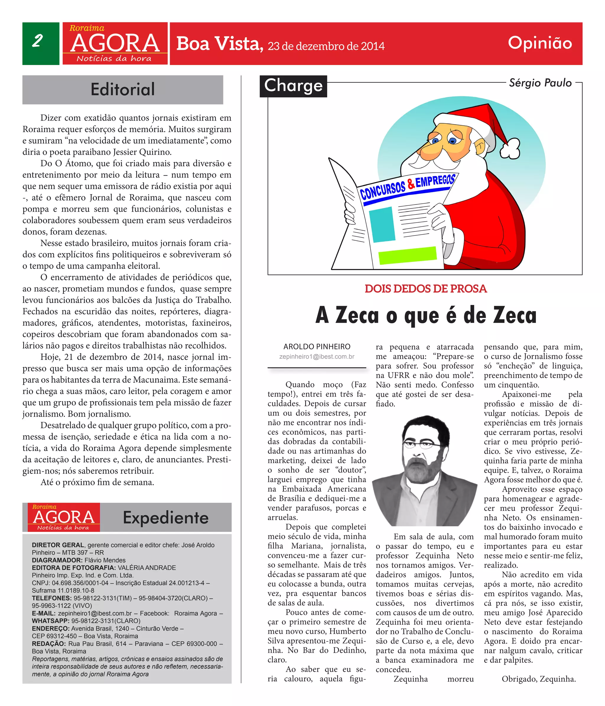 O documento descreve a trajetória do autor desde quando desistiu de três faculdades até fundar seu próprio jornal, o Roraima Agora. Ele conta sobre sua amizade com o professor Zequinha Neto, que o orientou em seu curso de jornalismo e a quem dedica o jornal como homenagem.
