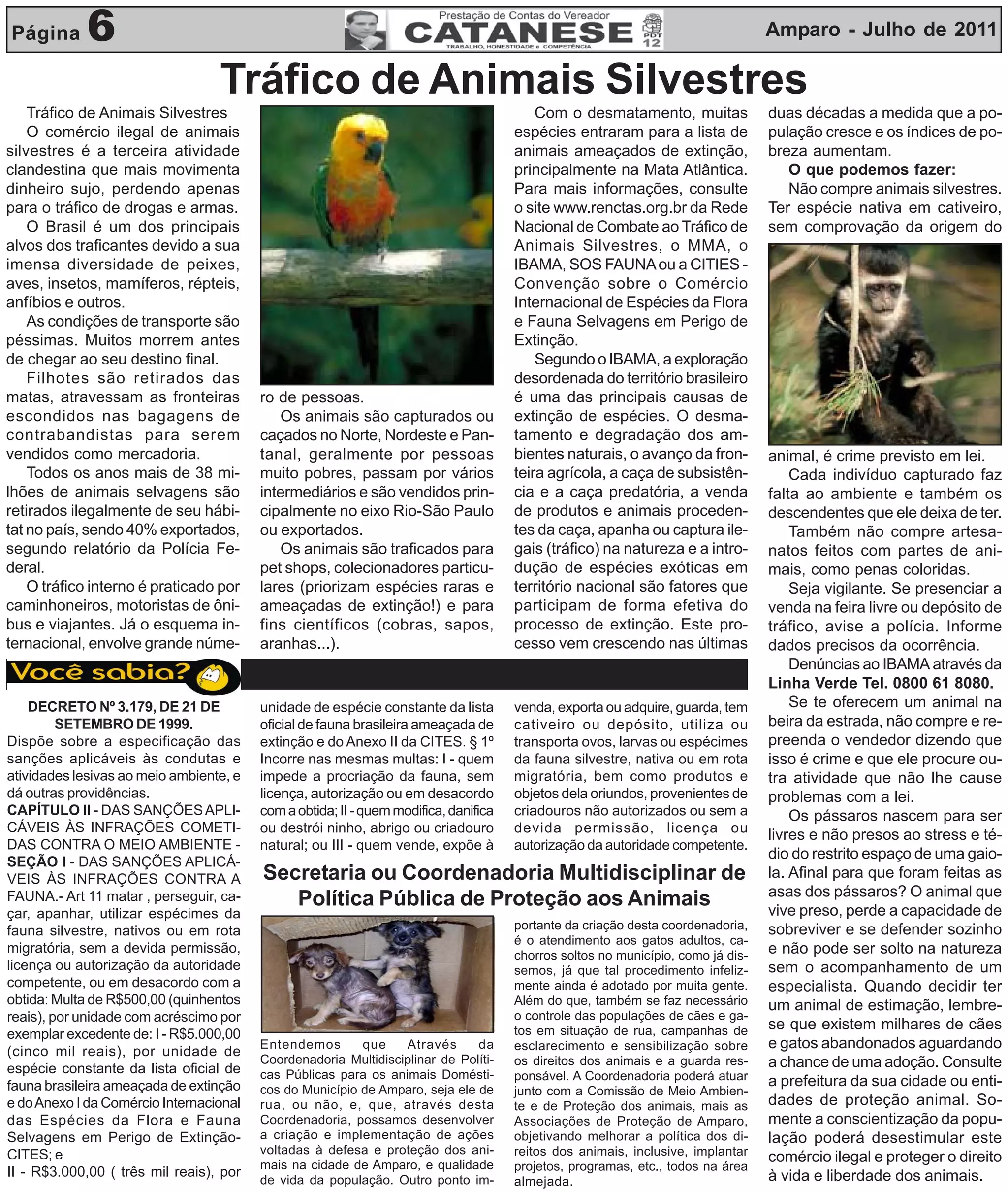 O documento discute o tráfico ilegal de animais silvestres no Brasil, que é a terceira atividade clandestina mais lucrativa. Milhões de animais são retirados ilegalmente de seus habitats todos os anos e vendidos no mercado negro. O documento propõe a criação de uma Coordenadoria Multidisciplinar de Política Pública para Proteção dos Animais em Amparo para desenvolver ações de defesa e proteção dos animais domésticos e silvestres na cidade.