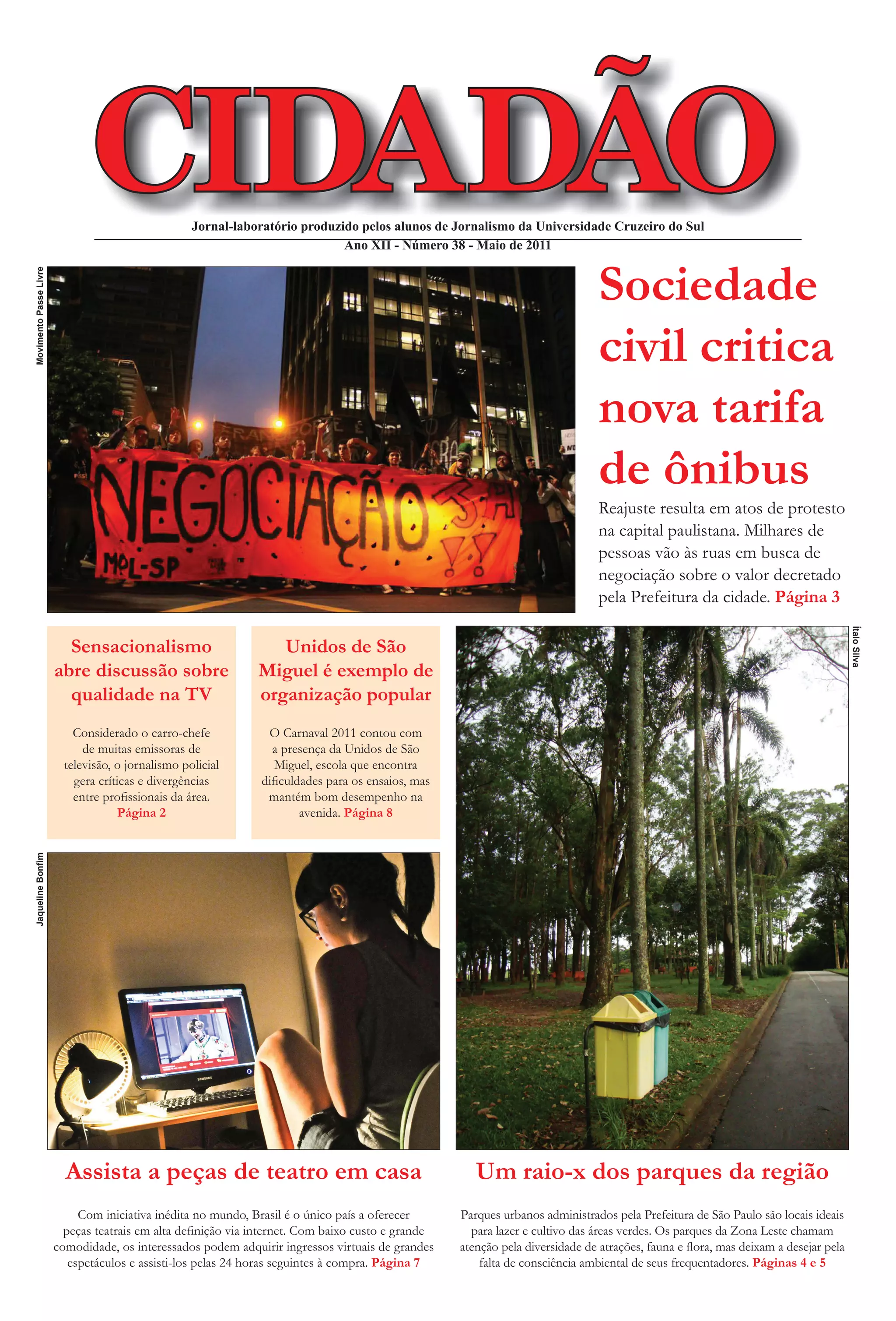 O documento é um jornal produzido por estudantes de jornalismo que contém as seguintes matérias: 1) protestos de moradores de São Paulo contra o aumento da tarifa de ônibus; 2) debate sobre sensacionalismo na TV; 3) exemplo de escola de samba que enfrenta dificuldades.