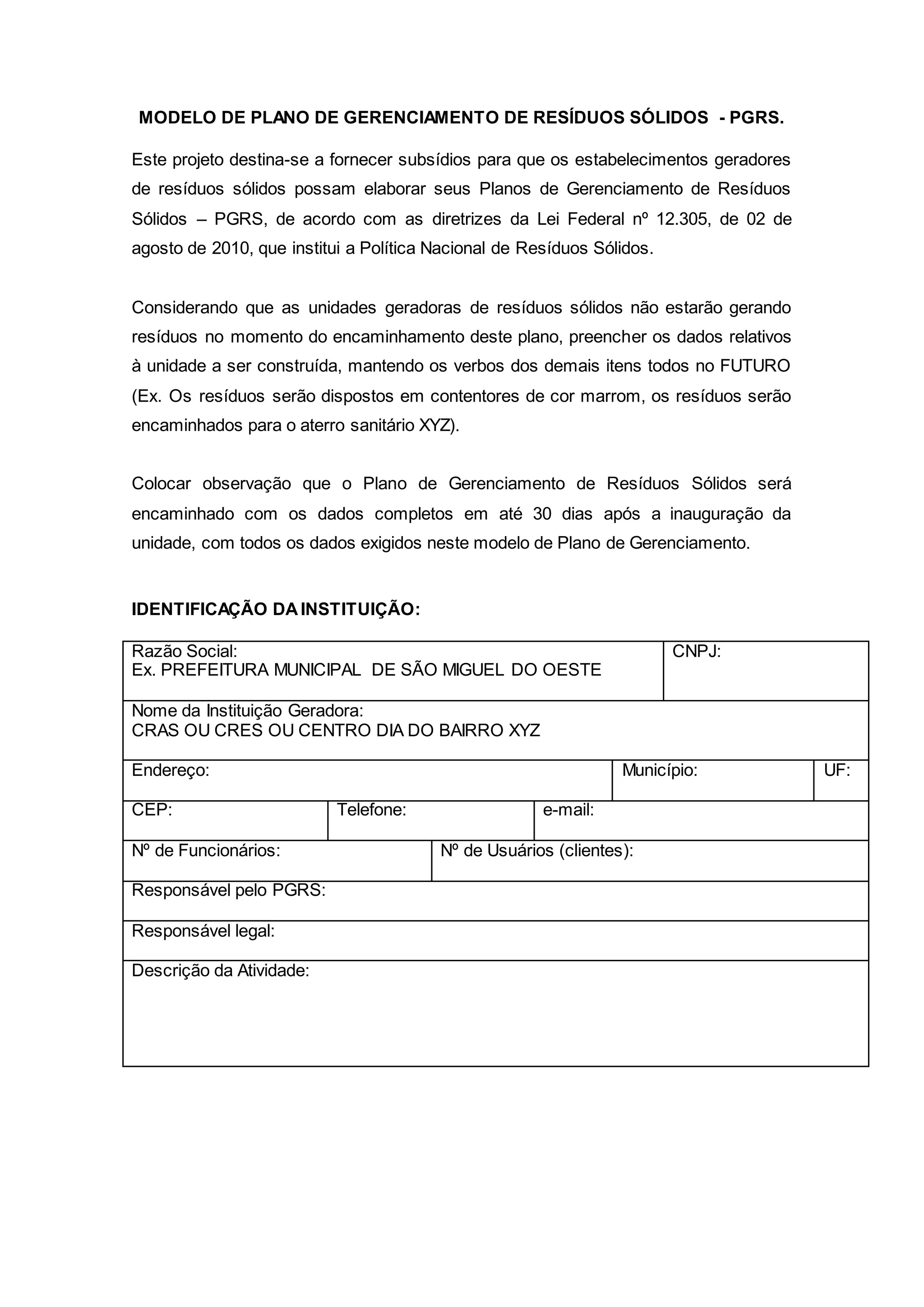 1) O documento fornece diretrizes para elaboração de Planos de Gerenciamento de Resíduos Sólidos (PGRS) por estabelecimentos geradores, de acordo com a Política Nacional de Resíduos Sólidos.