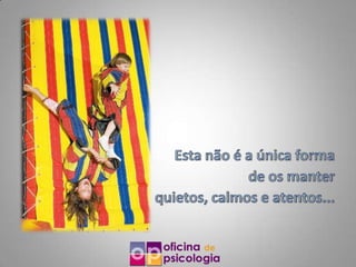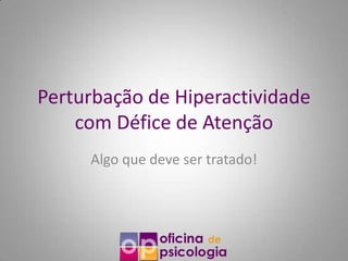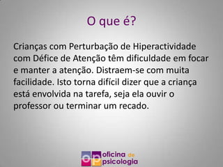 Este documento discute a Perturbação de Hiperatividade com Défice de Atenção (PHDA). Crianças com PHDA têm dificuldade em se concentrar e manter a atenção, distraindo-se facilmente. Isso dificulta a participação em tarefas. Os principais sintomas são défice de atenção, agitação psicomotora e impulsividade. Sem tratamento, a PHDA pode afetar negativamente o desenvolvimento escolar e social da criança. O diagnóstico é feito por psicólogos com