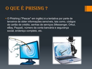 Phising é um tipo de golpe onde criminosos tentam obter informações pessoais e financeiras das pessoas através de e-mails ou sites falsos. Isso pode resultar em roubo de dinheiro, transferências não autorizadas ou dívidas no nome da vítima. Para se proteger, não forneça dados pessoais em e-mails ou sites suspeitos e sempre verifique a segurança das páginas antes de inserir informações confidenciais.