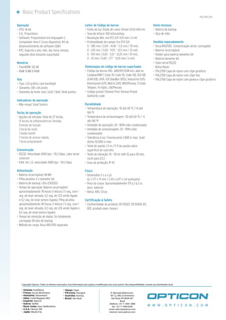 O documento descreve um terminal portátil com leitor de código de barras laser, IrDA e IP54, com especificações técnicas como CPU de 16 bits, memória flash de 512kB, RAM de 8MB, tela LCD de 128x64 pixels e bateria recarregável de 78 horas de duração. Apresenta também informações sobre simbologias de código de barras suportadas, comunicações RS-232 e IrDA, e certificações.