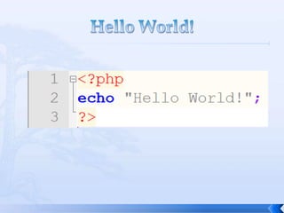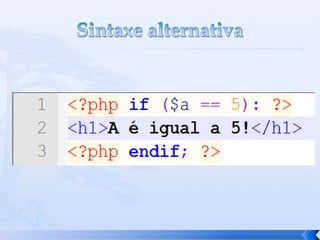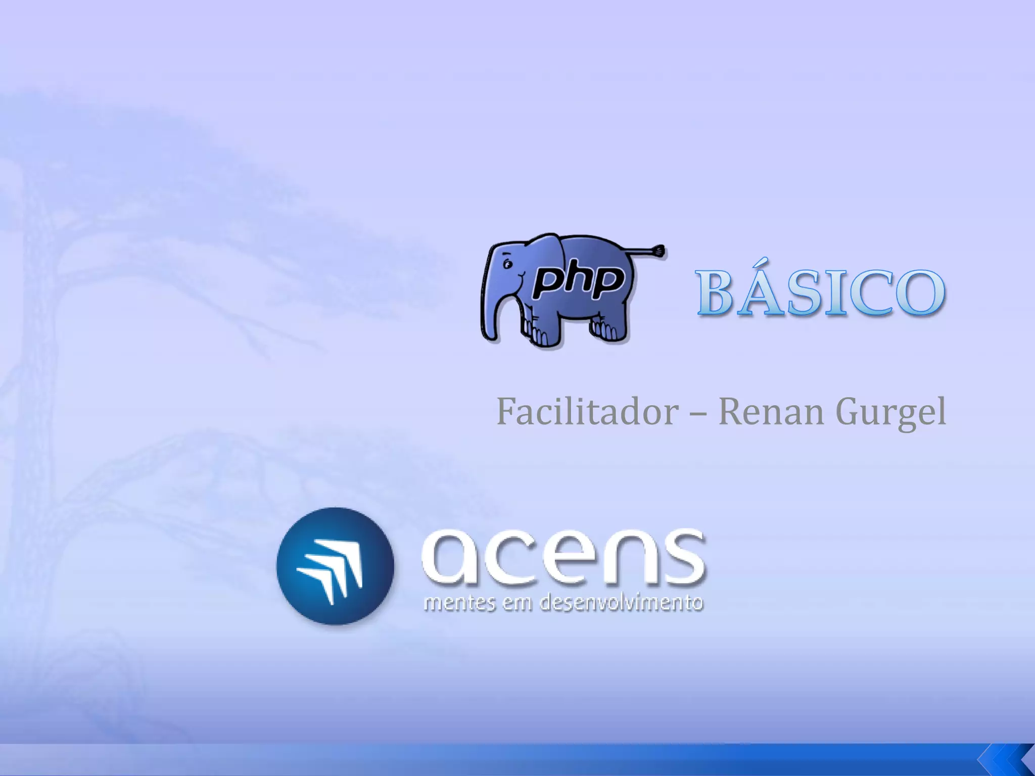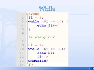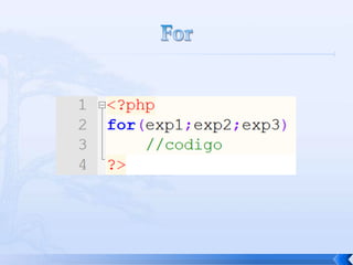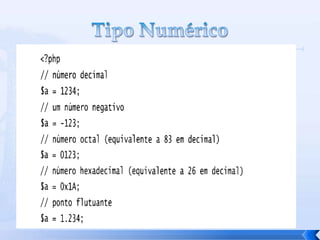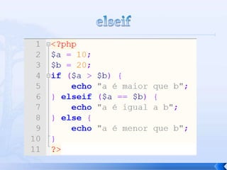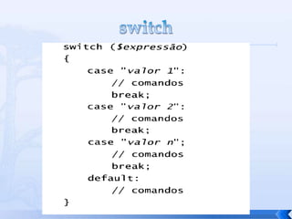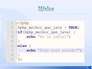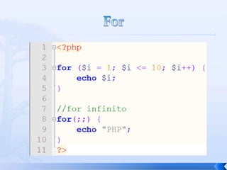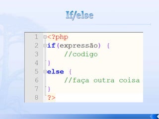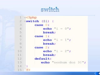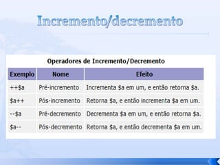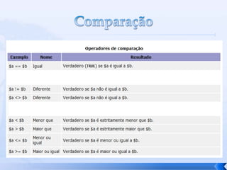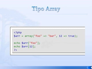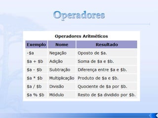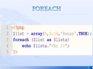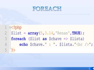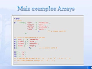 O documento resume conceitos básicos de PHP, incluindo sintaxe, variáveis, arrays, estruturas de controle, funções e inclusão de arquivos. É apresentado o uso de comentários, variáveis, tipos booleanos, operadores, arrays, estruturas de repetição e controle como if/else e foreach, além de funções built-in e inclusão de arquivos.