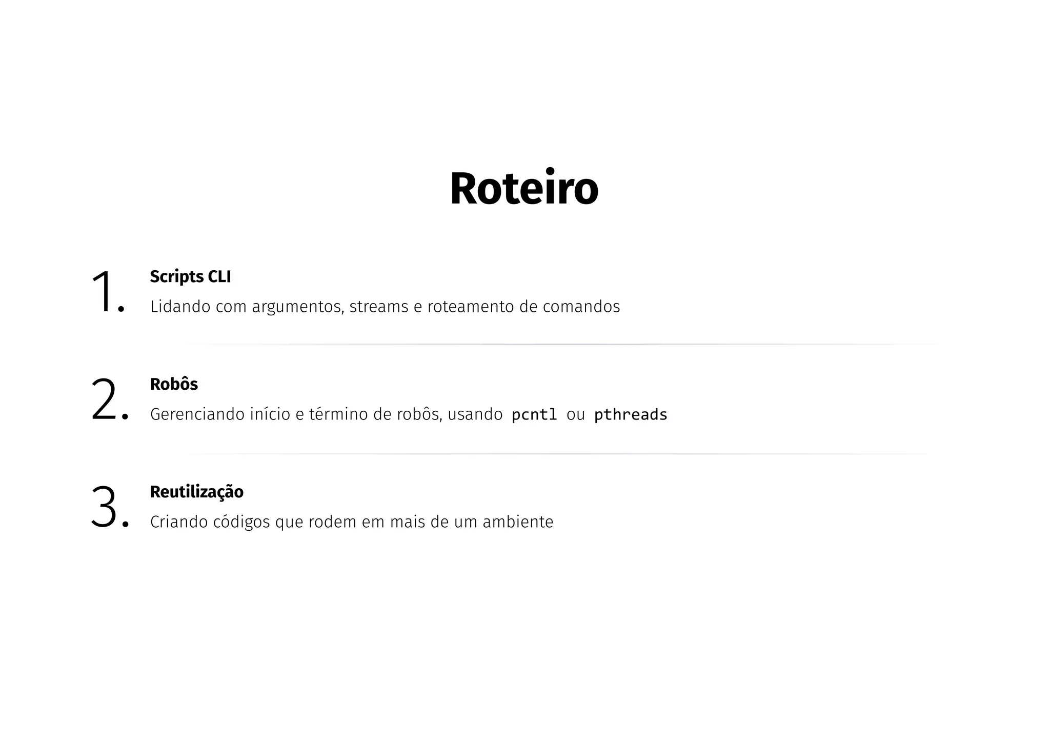 1) Lidar com argumentos, streams e roteamento de comandos;