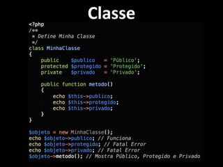 PHP é uma linguagem de programação orientada a objetos que suporta classes, construtores, destrutores, métodos estáticos, herança, classes abstratas, métodos abstratos, namespaces, interfaces, traits, autoload, exceptions, filtragem de dados e referências como o site oficial do PHP e o PHP The Right Way.
