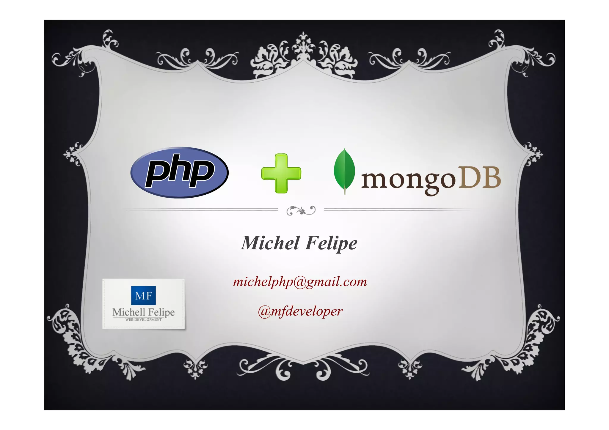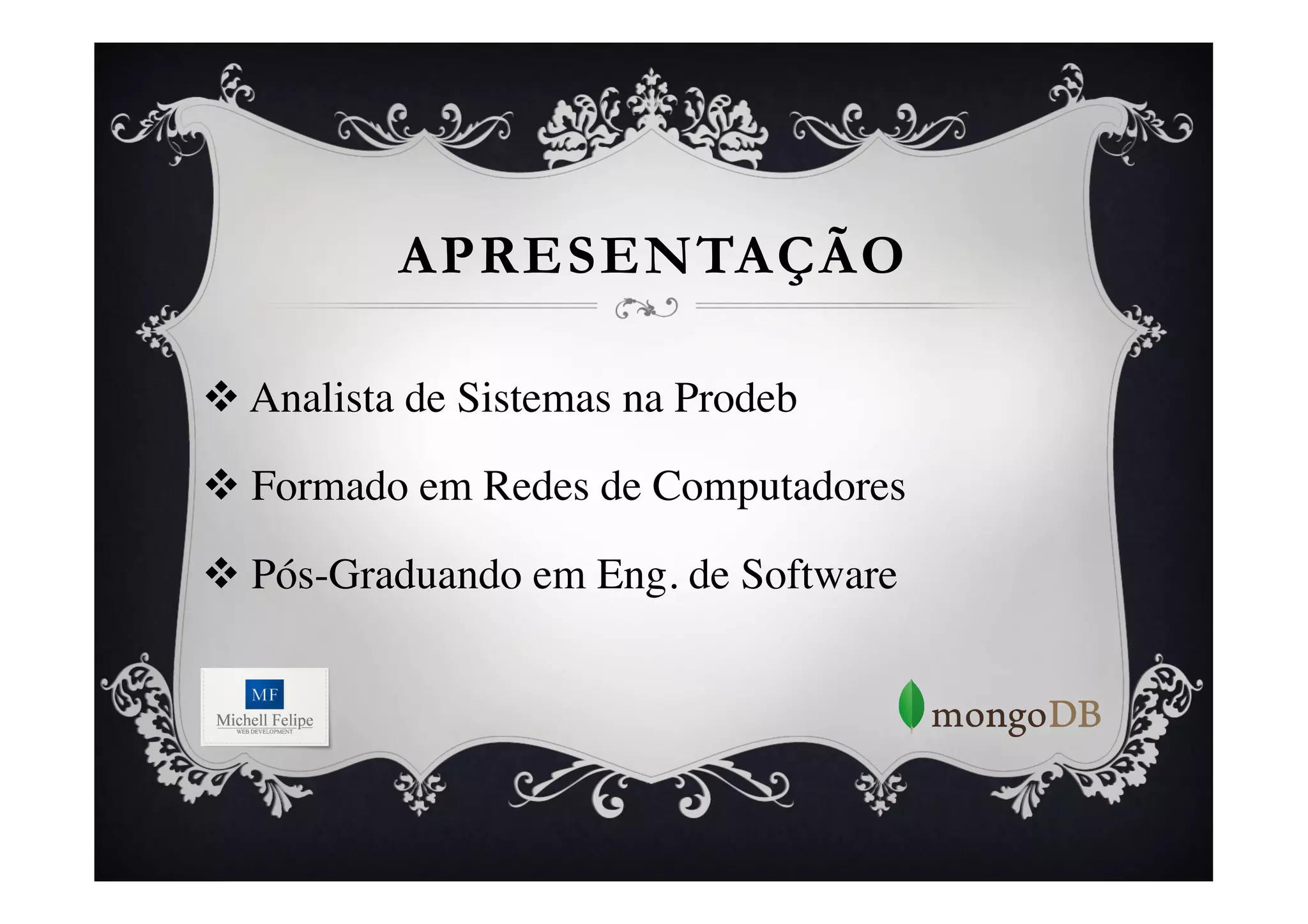 O documento apresenta Michel Felipe e sua experiência como analista de sistemas. A agenda inclui tópicos sobre MongoDB como características, instalação, comandos no shell, PHP e MongoDB para armazenamento e recuperação de dados. O documento também discute conceitos de bancos de dados NoSQL e como MongoDB pode ser usado para armazenar grandes quantidades de imagens.