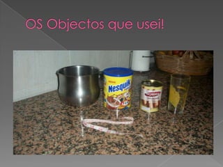 Este documento apresenta as medições do diâmetro e perímetro de vários objetos circulares como latas e copos. A tabela mostra que a razão entre o perímetro e o diâmetro de cada objeto é aproximadamente 3. A conclusão é que o perímetro de qualquer objeto circular é sempre cerca de 3 vezes maior que seu diâmetro.