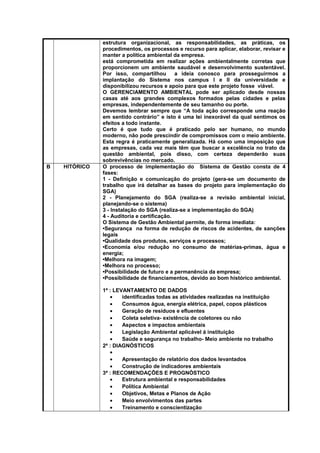 O projeto interdisciplinar de implantação do Sistema de Gestão Ambiental (SGA) na universidade visa reduzir o consumo de recursos naturais e promover a preservação ambiental, envolvendo alunos na coleta de dados e elaboração de relatórios. A implementação do SGA é estruturada em quatro fases, proporcionando benefícios financeiros e melhorias na imagem institucional. O compromisso com práticas ambientalmente corretas é essencial para garantir a sustentabilidade e a competitividade da universidade no mercado.