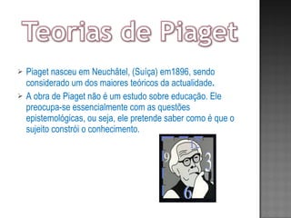 O documento descreve a teoria do desenvolvimento cognitivo de Jean Piaget, incluindo os quatro estágios (sensório-motor, pré-operatório, operações concretas e formal) e os processos de assimilação e acomodação que levam às mudanças nos esquemas cognitivos ao longo dos estágios.