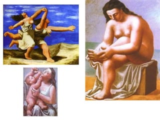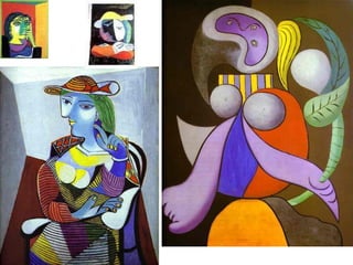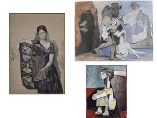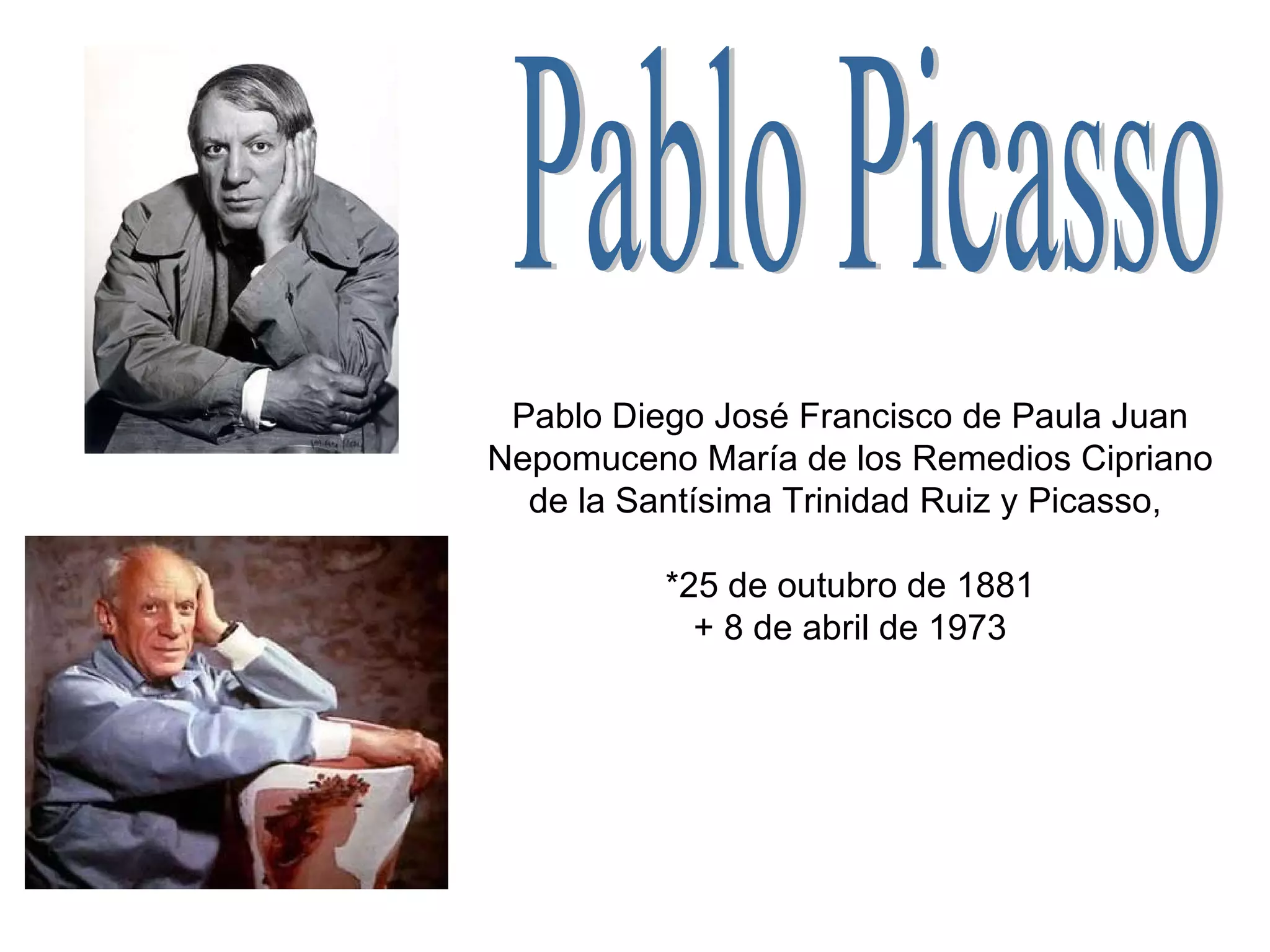 Picasso foi um pintor espanhol nascido em 1881 que revolucionou a arte moderna através do cubismo. Ele teve várias mulheres e filhos ao longo de sua vida e é famoso por obras como A Fase Azul, A Fase Rosa e Guernica, pintura de protesto contra a violência da guerra.