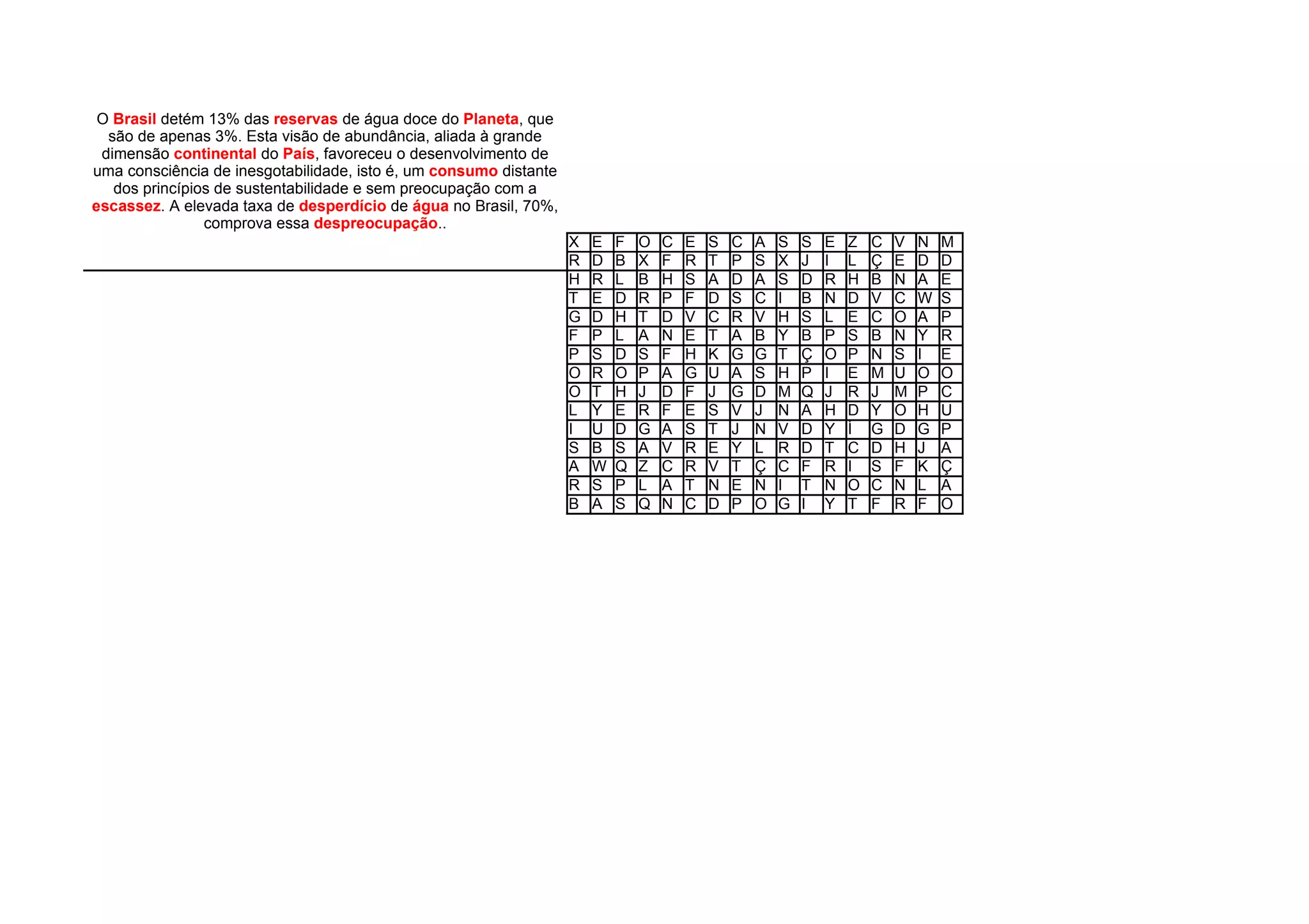 O Brasil detém uma grande quantidade das reservas mundiais de água doce, porém há um alto nível de desperdício de água no país devido à percepção equivocada de que os recursos hídricos são inesgotáveis. Isso comprova a falta de consciência sobre a escassez de água e a necessidade de práticas sustentáveis.