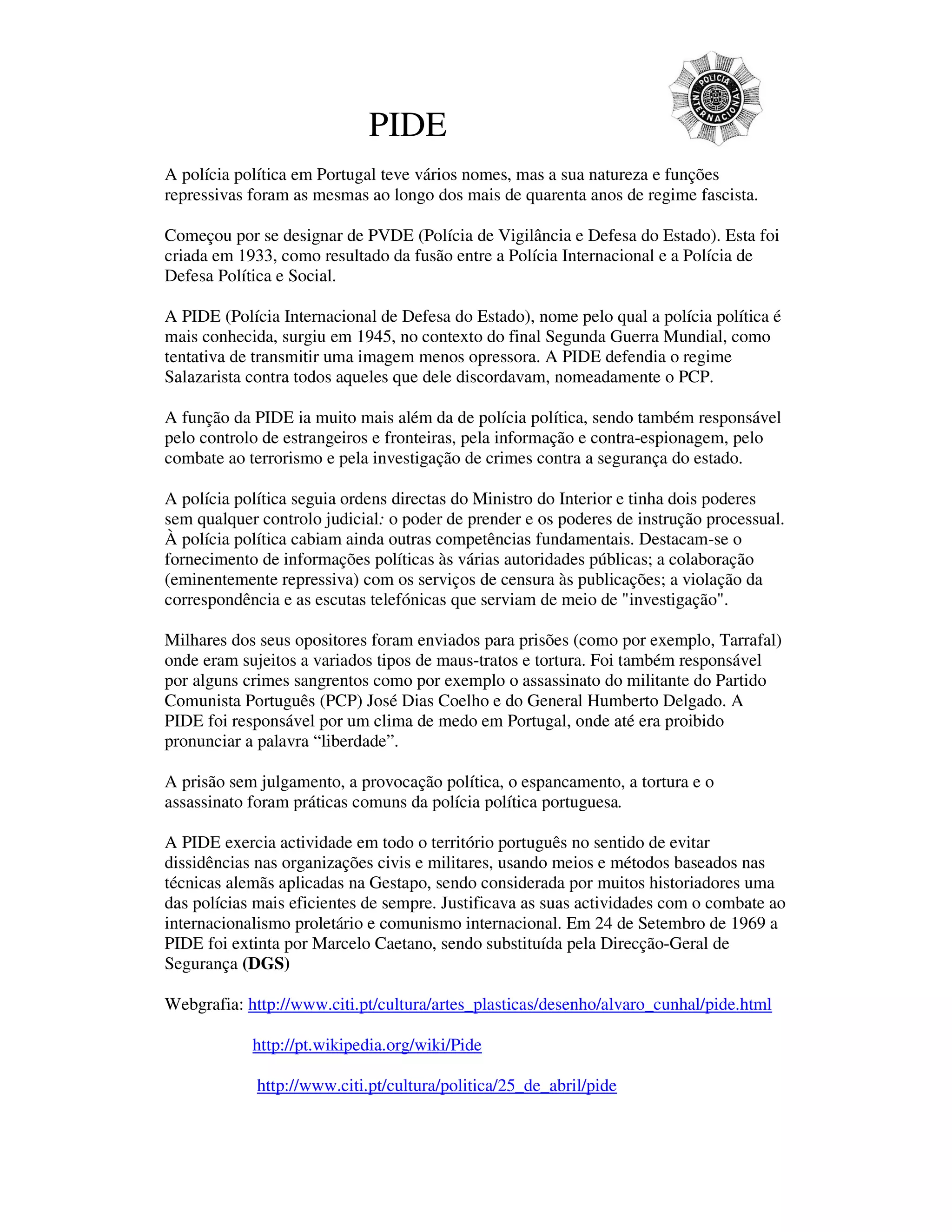 A PIDE foi a polícia política em Portugal durante o regime fascista de Salazar, exercendo controle sobre os opositores políticos através de prisões, tortura e assassinatos. Surgiu em 1945 para substituir a PVDE e defender o regime contra inimigos como o Partido Comunista Português. Foi extinta em 1969 e substituída pela Direção Geral de Segurança.