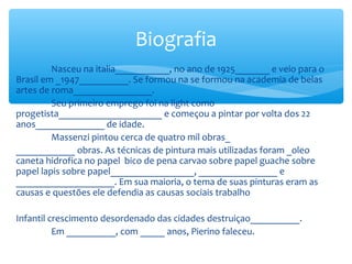 Pierino Massenzi nasceu na Itália em 1925 e se mudou para o Brasil em 1947. Ele se formou na Academia de Belas Artes de Roma e seu primeiro emprego foi como projetista na Light. Massenzi pintou cerca de 4 mil obras ao longo de sua carreira utilizando diversas técnicas como óleo, caneta hidrográfica e guache. Suas pinturas geralmente retratavam causas sociais como trabalho infantil e crescimento desordenado das cidades. Ele faleceu em ____ aos ____ anos.