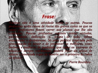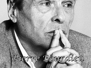 Pierre Bourdieu foi um importante sociólogo francês do século XX. Ele estudou como as desigualdades sociais são perpetuadas através da educação e do gosto cultural, mostrando que o capital cultural adquirido na família influencia o desempenho e as oportunidades dos alunos. Bourdieu também criticou a reprodução das elites dominantes e a violência simbólica exercida pelo sistema escolar.