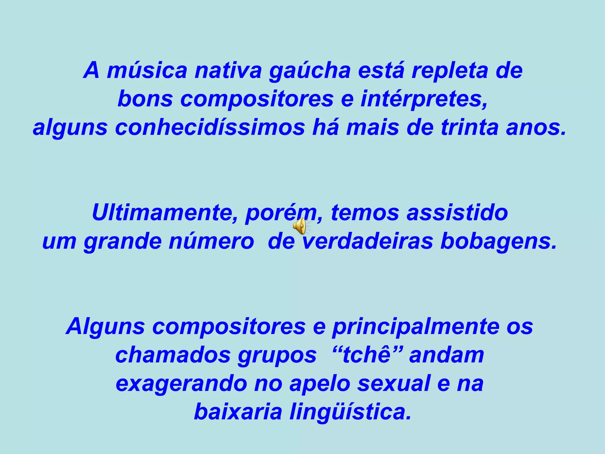 O documento discute a música nativa gaúcha e como alguns compositores e grupos musicais têm exagerado no apelo sexual e linguagem vulgar nas letras, enquanto outros como Miro Saldanha se preocupam com a beleza da poesia. A música "Pilares" de Miro Saldanha é destacada por abordar a decadência das relações familiares e morais de forma valiosa.