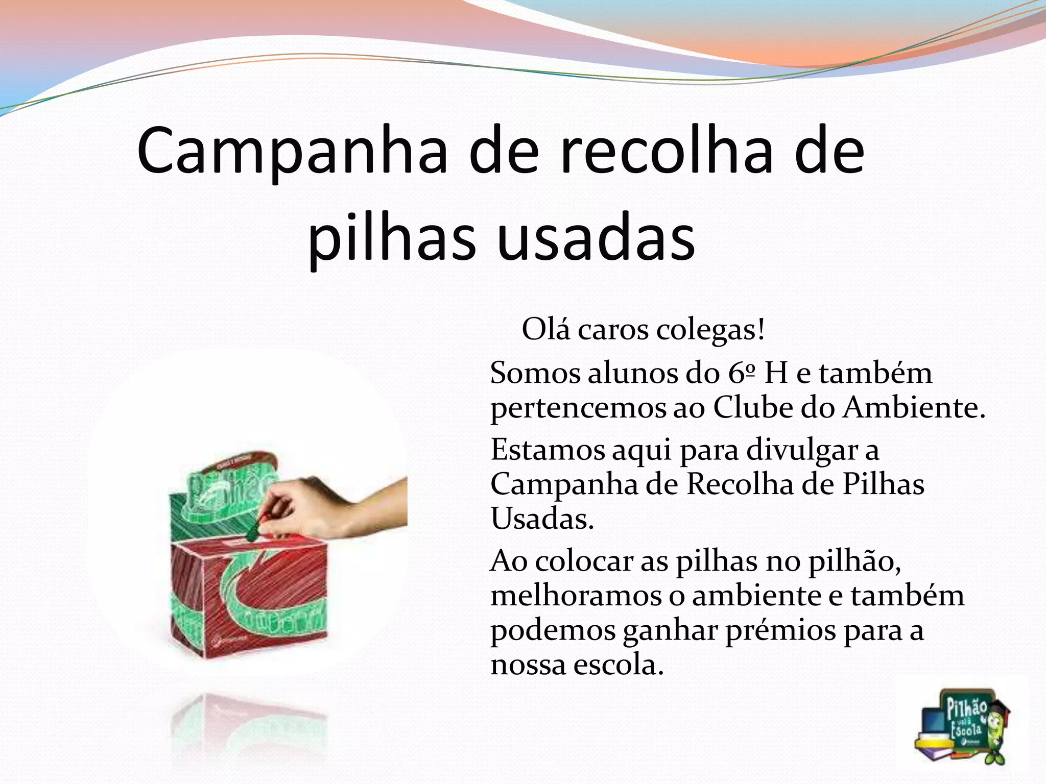 Os alunos do 6o ano estão promovendo uma campanha de recolha de pilhas usadas até 31 de maio para ganhar prêmios para sua escola, depositando as pilhas nos pilhões localizados na entrada dos pavilhões, biblioteca e polivalente. Quanto mais pilhas forem coletadas, mais pontos e melhores prêmios eles poderão ganhar.