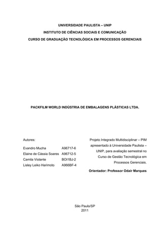 Este documento descreve a Packfilm World Indústria de Embalagens Plásticas Ltda., incluindo sua fundação em 1975, constituição como sociedade limitada, ramo de atuação na produção de filmes plásticos, faturamento anual de R$20 milhões e força de trabalho de 75 a 95 funcionários. Também apresenta detalhes sobre equipamentos, produtos, mercados, concorrentes e estrutura administrativa da empresa.