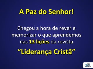 O documento resume 13 lições sobre liderança cristã de uma revista. As lições discutem tópicos como o perfil bíblico de um líder, a importância da maturidade e preparação, a vocação divina, a oração, a família do líder e o estilo inspirador de liderança. O documento incentiva os leitores a revisar essas lições para entender melhor os segredos da liderança eficaz.