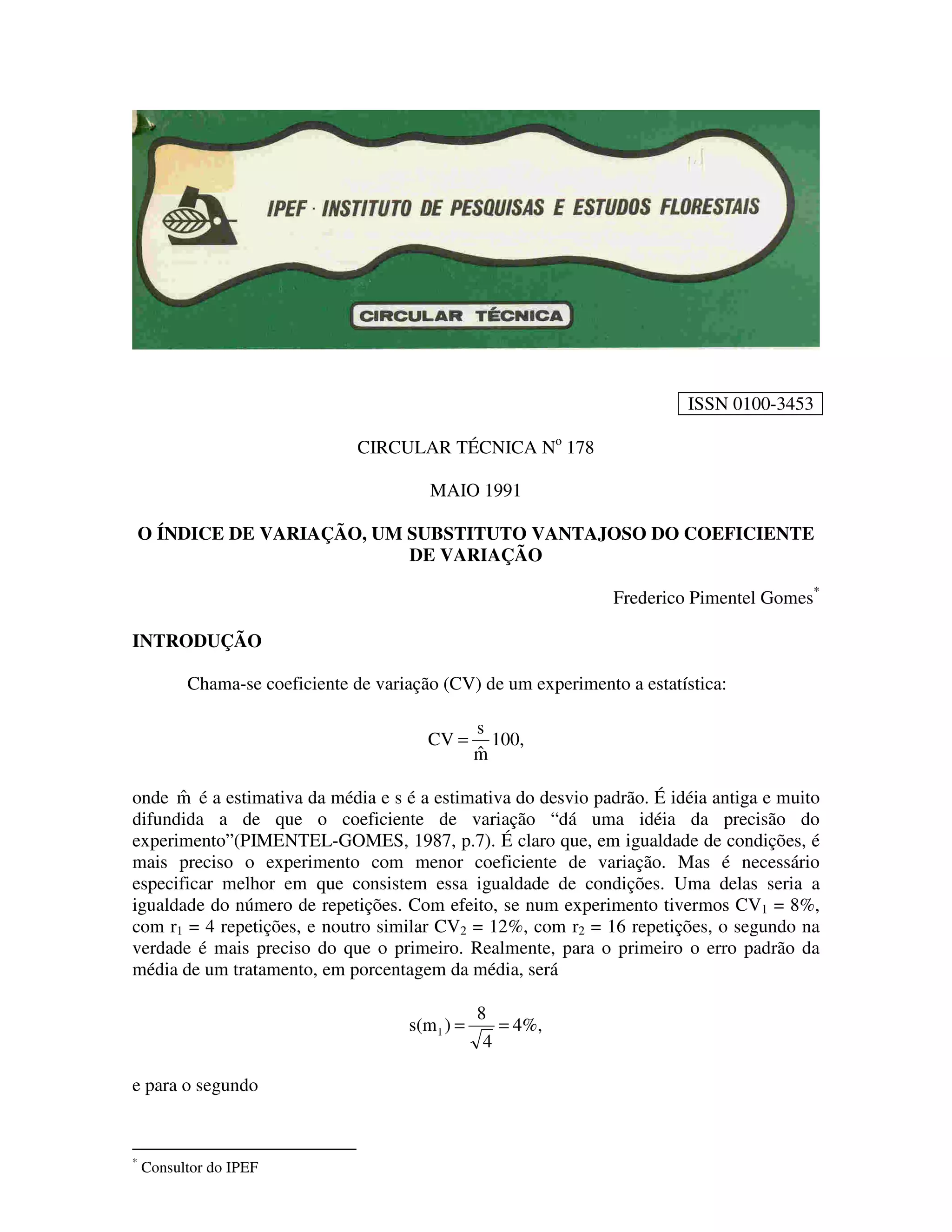 Este documento introduz o índice de variação como uma estatística alternativa ao coeficiente de variação para avaliar a precisão de experimentos. O índice de variação leva em conta o número de repetições do experimento, ao contrário do coeficiente de variação. Experimentos com menor índice de variação tendem a ser mais precisos. O tamanho ideal das parcelas em experimentos florestais deve ser escolhido para minimizar o índice de variação.