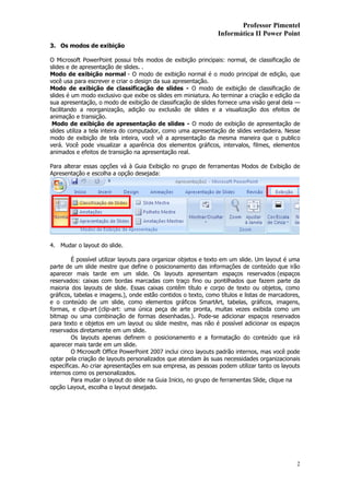 Este documento fornece instruções sobre como usar o Microsoft PowerPoint 2007. Discute os principais modos de exibição e como adicionar slides, texto, imagens, animações e outros elementos a uma apresentação. Também explica como formatar slides, alterar a ordem dos slides e executar uma apresentação.