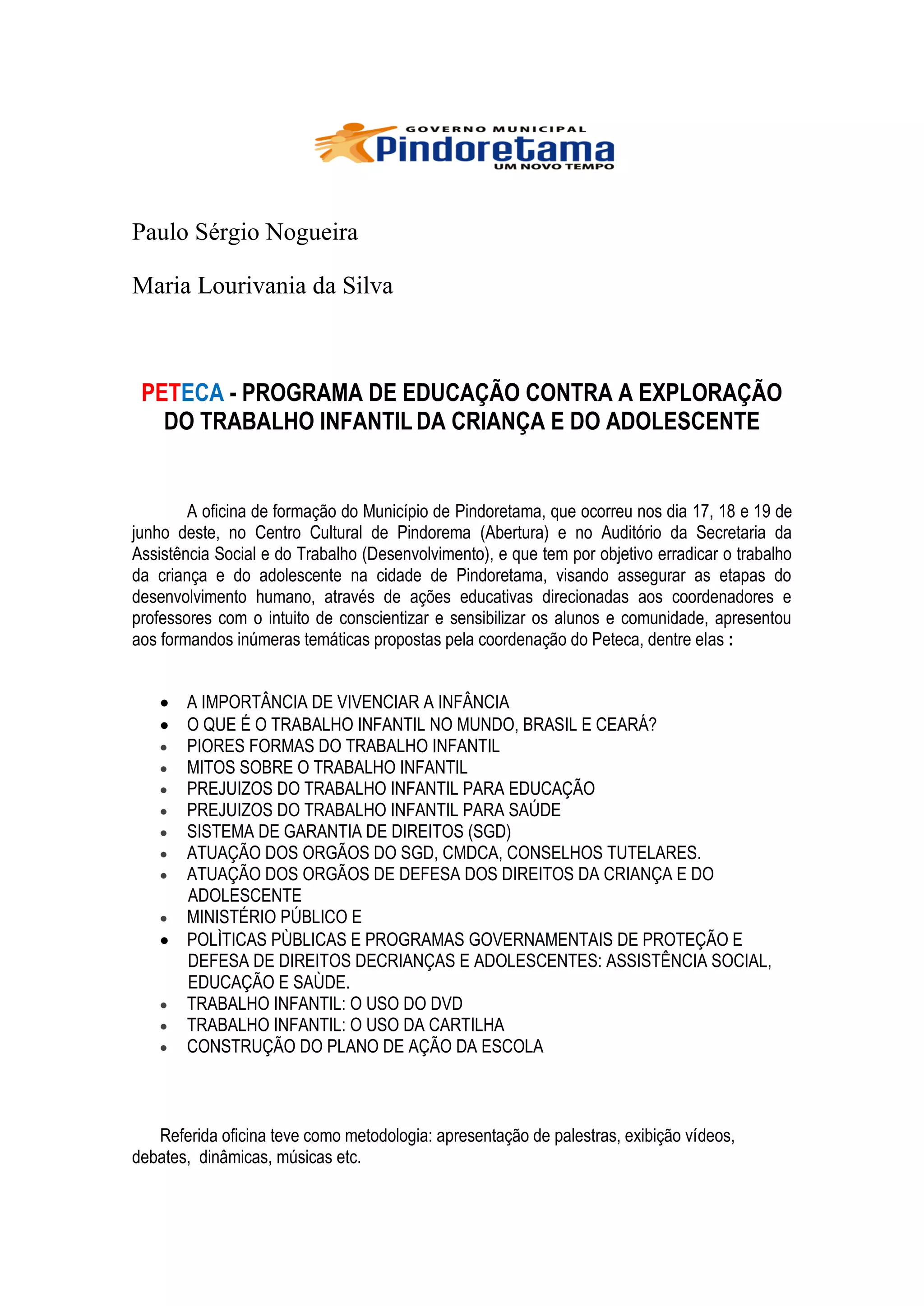 A oficina de formação teve como objetivo erradicar o trabalho infantil em Pindoretama através de ações educativas. Os participantes aprenderam sobre os impactos negativos do trabalho infantil, os direitos das crianças e adolescentes, e desenvolveram planos de ação para suas escolas. A formação sensibilizou os educadores sobre a importância de proteger a infância.