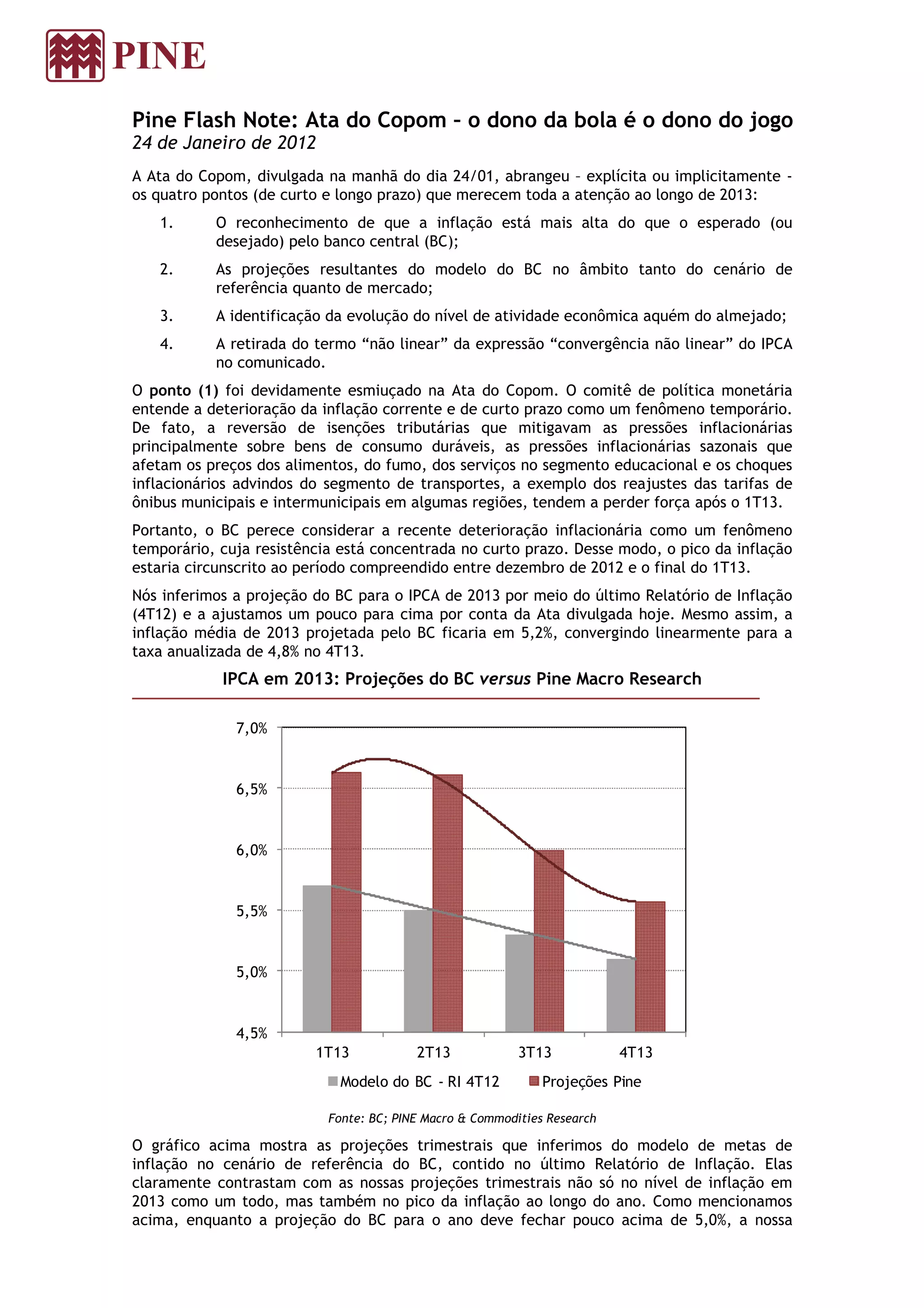 O documento resume a ata da última reunião do Copom. (1) O Copom reconhece que a inflação está mais alta do que o esperado e temporariamente. (2) As projeções do BC apontam para piora da inflação em 2013 em comparação à reunião anterior. (3) A atividade econômica está aquém do esperado, devido a limitações na oferta mais do que na demanda.