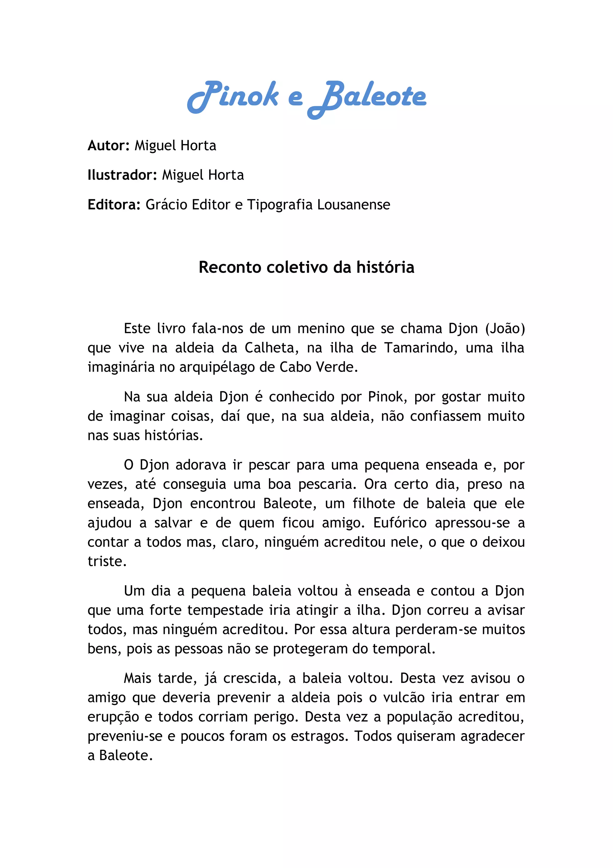 Este livro conta a história de Djon, um menino que vive na ilha de Tamarindo e é conhecido como Pinok por gostar de imaginar histórias. Um dia, Pinok encontra e salva um filhote de baleia chamado Baleote, que se torna seu amigo. Quando Baleote avisa Pinok sobre uma tempestade e erupção vulcânica iminentes, ninguém acredita nele, exceto da segunda vez. Anos depois, quando as baleias da mãe de Baleote precisam de ajuda contra baleeiros