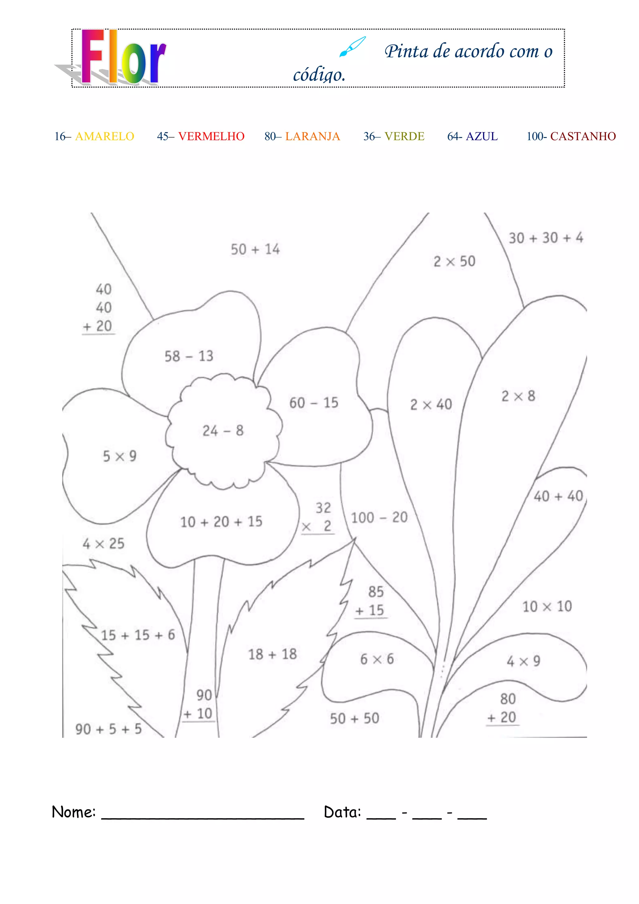 O documento fornece um código de cores para pintar algo, incluindo amarelo (16), vermelho (45), laranja (80), verde (36) e azul (64), castanho (100), solicitando o nome e data do pintor.