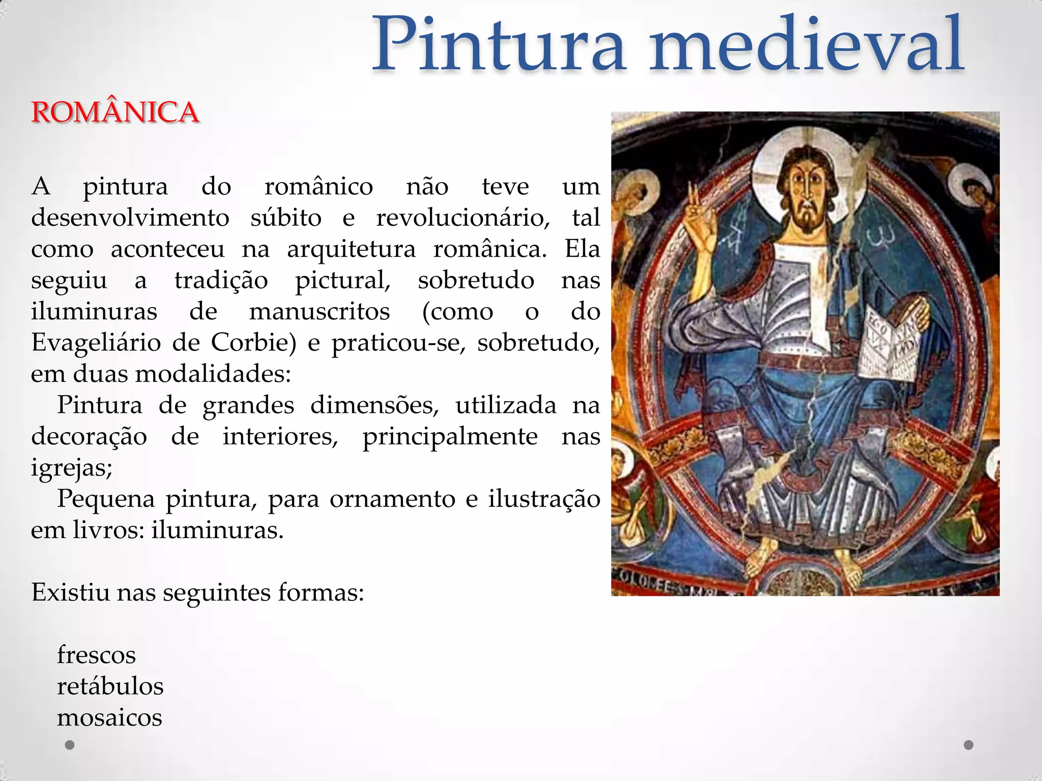 O documento descreve a pintura medieval românica e gótica, detalhando suas características e evolução. A pintura românica era predominantemente religiosa e usava cores planas, enquanto a gótica se tornou mais naturalista ao longo dos séculos. A pintura em painéis se tornou dominante no século 15, substituindo os afrescos e vitrais.