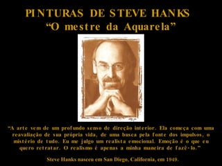 O documento descreve o pintor americano Steve Hanks, nascido em 1949 em San Diego, Califórnia. Hanks é considerado um mestre da aquarela e acredita que a arte vem de dentro, de uma busca pessoal por significado. Ele se vê como um realista emocional, usando o realismo para retratar emoções.