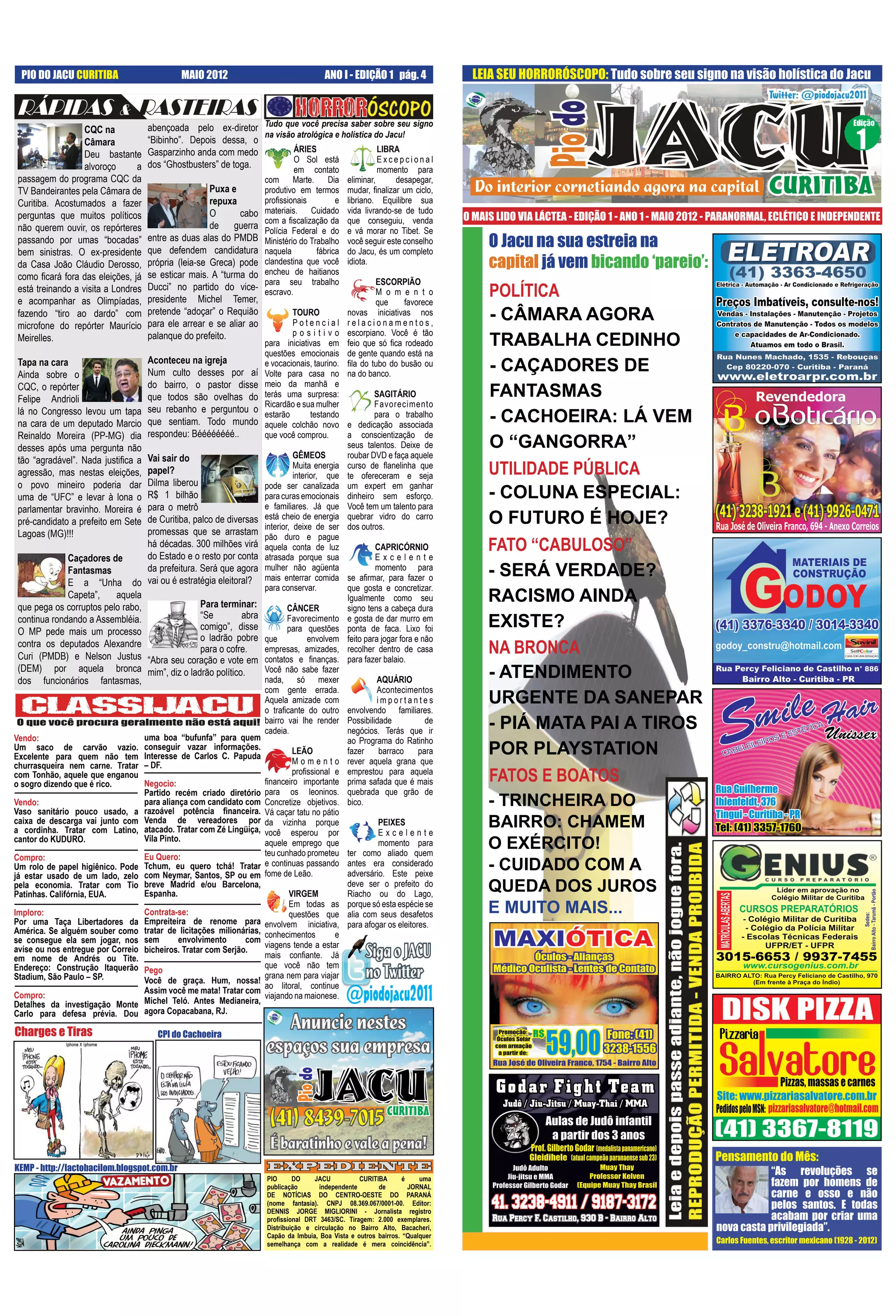 O documento fornece informações sobre previsões astrológicas para cada signo do zodíaco, notícias políticas e fatos da cidade de Curitiba, além de anúncios classificados e charges. Em 3 frases: