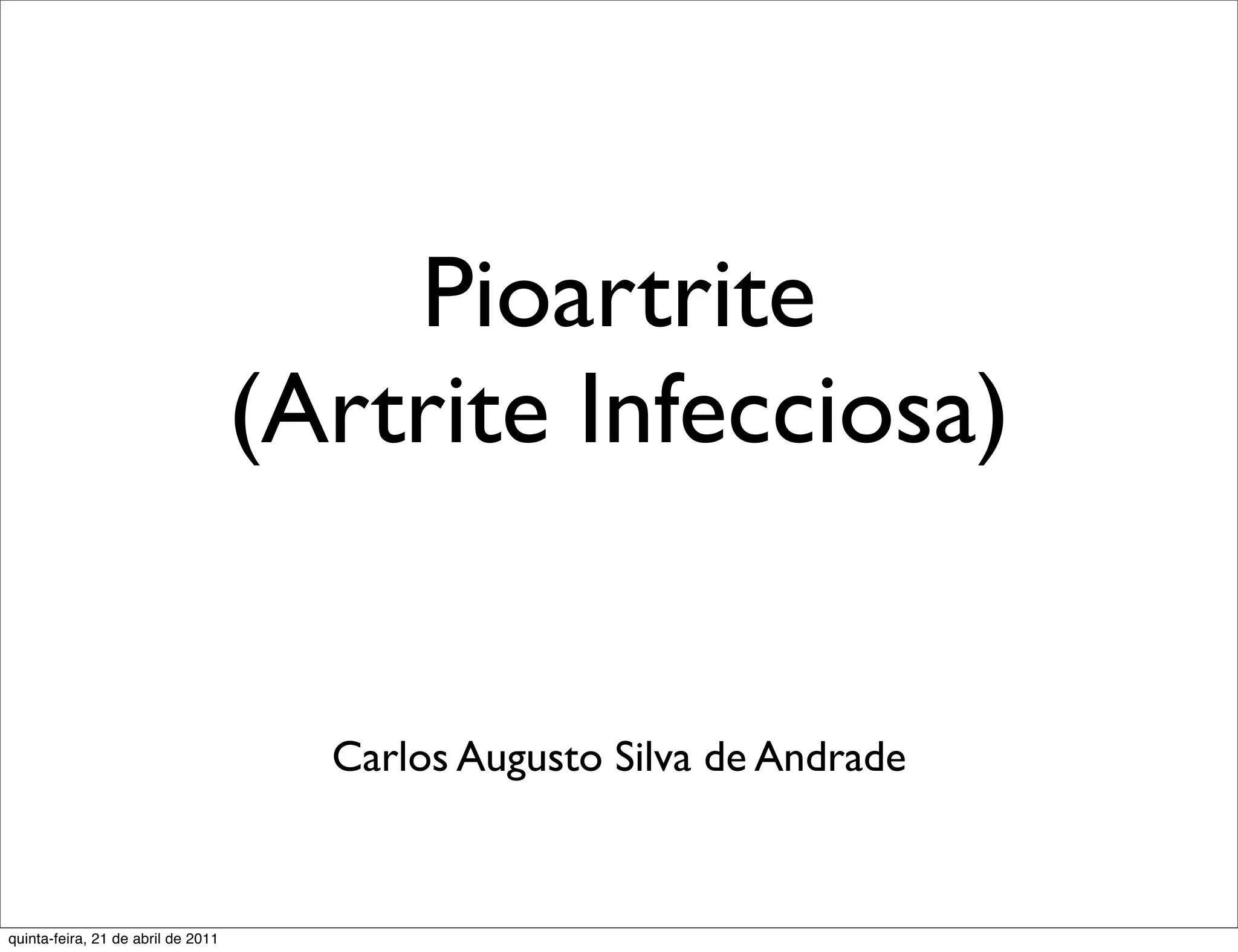 O documento descreve a pioartrite, uma artrite infecciosa. A pioartrite é definida como uma infecção do líquido articular causada por um agente bacteriano, sendo que a maioria das culturas é negativa. Os sintomas e sinais clínicos diferem entre recém-nascidos, crianças e adultos, sendo os exames laboratoriais como VHS, PCR e hemocultura importantes para o diagnóstico, assim como a análise do líquido sinovial. O documento também discute critérios diagnó