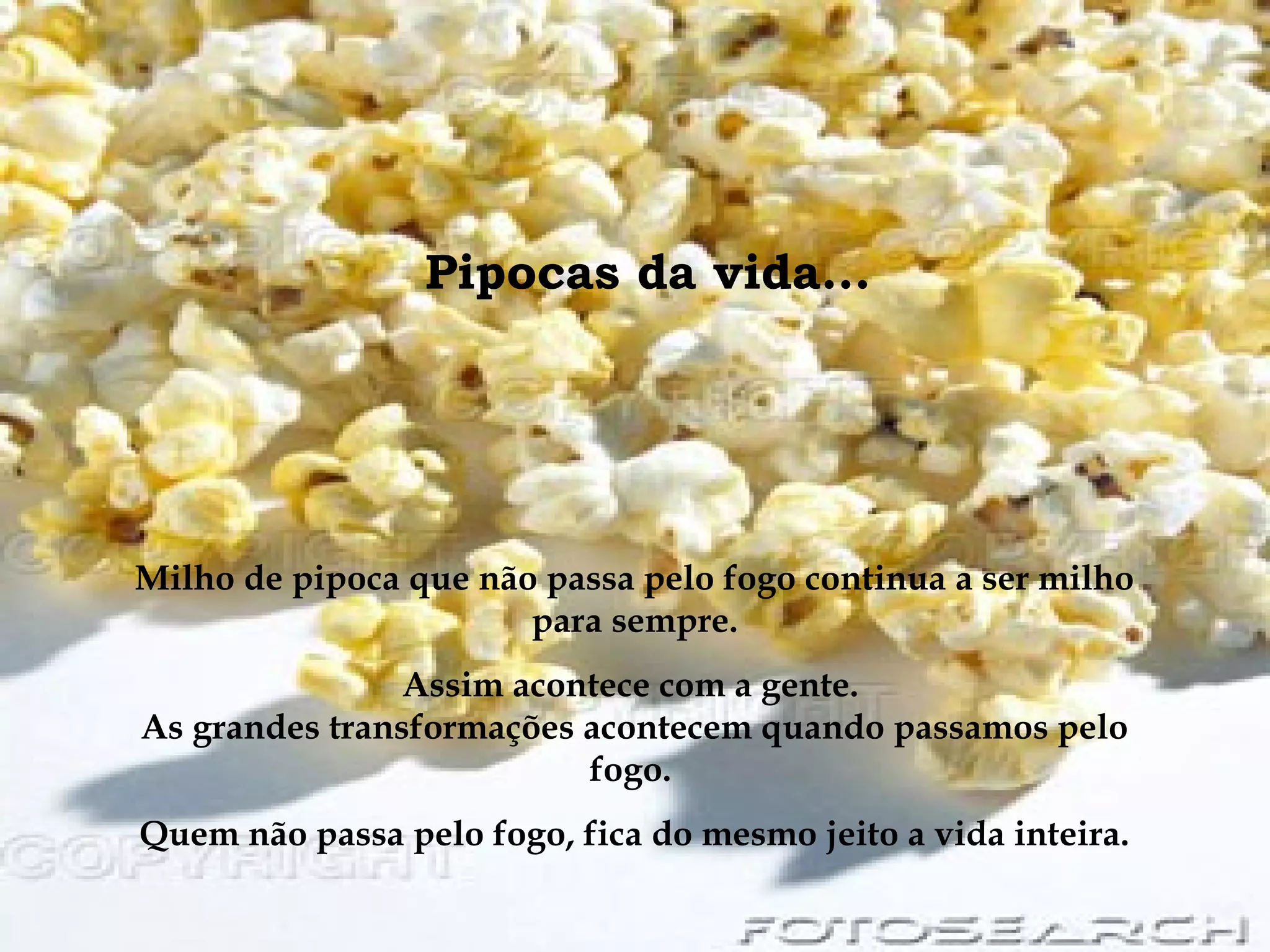 O documento faz uma comparação entre pipocas e pessoas, argumentando que grandes transformações só ocorrem quando passamos por situações difíceis na vida, representadas pelo "fogo". Enquanto a pipoca precisa do fogo para estourar e revelar seu potencial, algumas pessoas se recusam a mudar mesmo sob pressão, permanecendo "duras" como o milho que não pipoca.