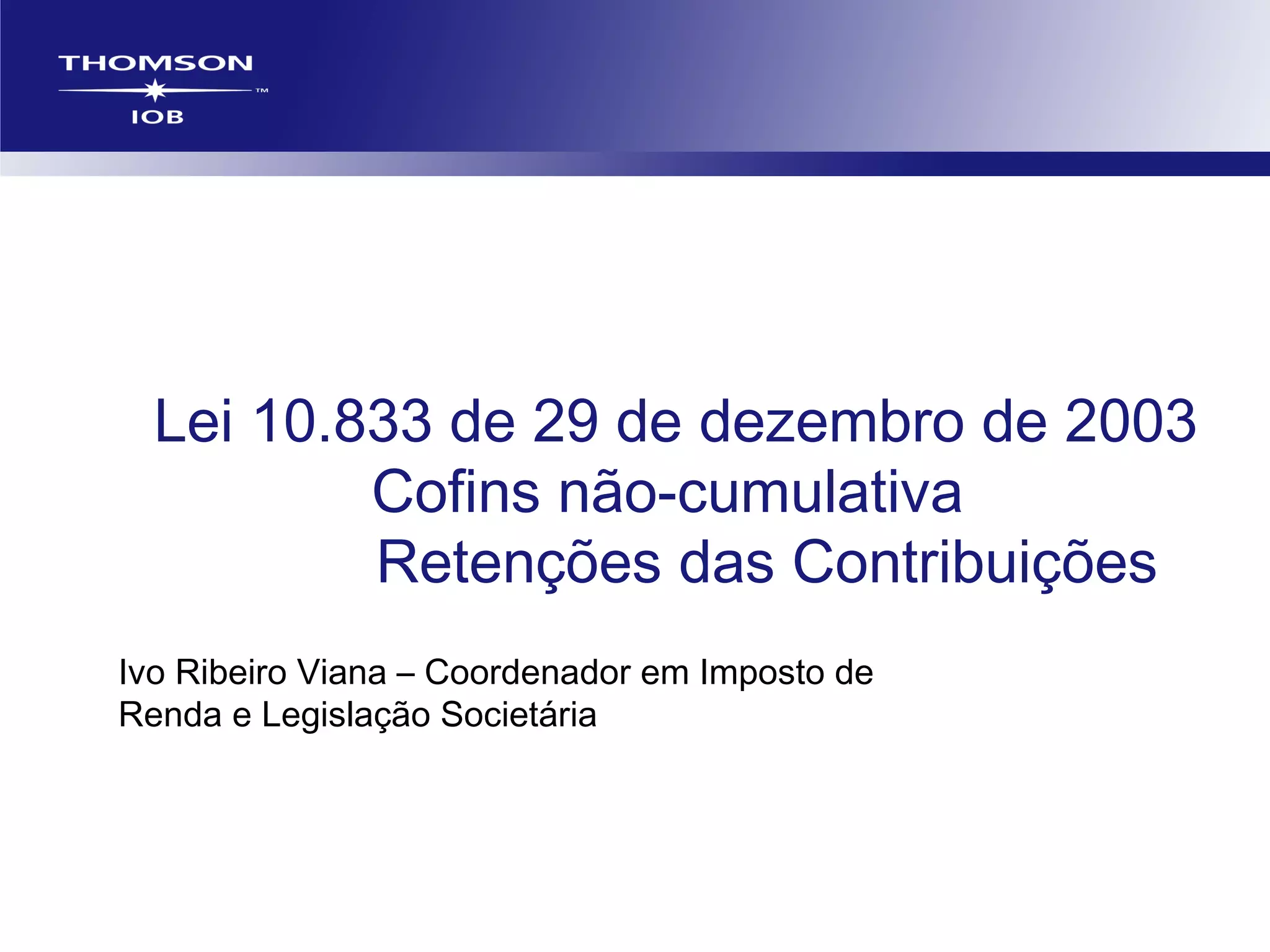 1) O documento descreve as novas regras para a Cofins não-cumulativa a partir de 1o de fevereiro de 2003, incluindo a base de cálculo, créditos, isenções e retenções na fonte. 2) Empresas tributadas com base no lucro real estão sujeitas à Cofins não-cumulativa de 7,6% sobre o faturamento mensal, com possibilidade de créditos sobre insumos e despesas. 3) Também são descritas as regras para retenção na fonte da Cofins, PIS e CSSL em