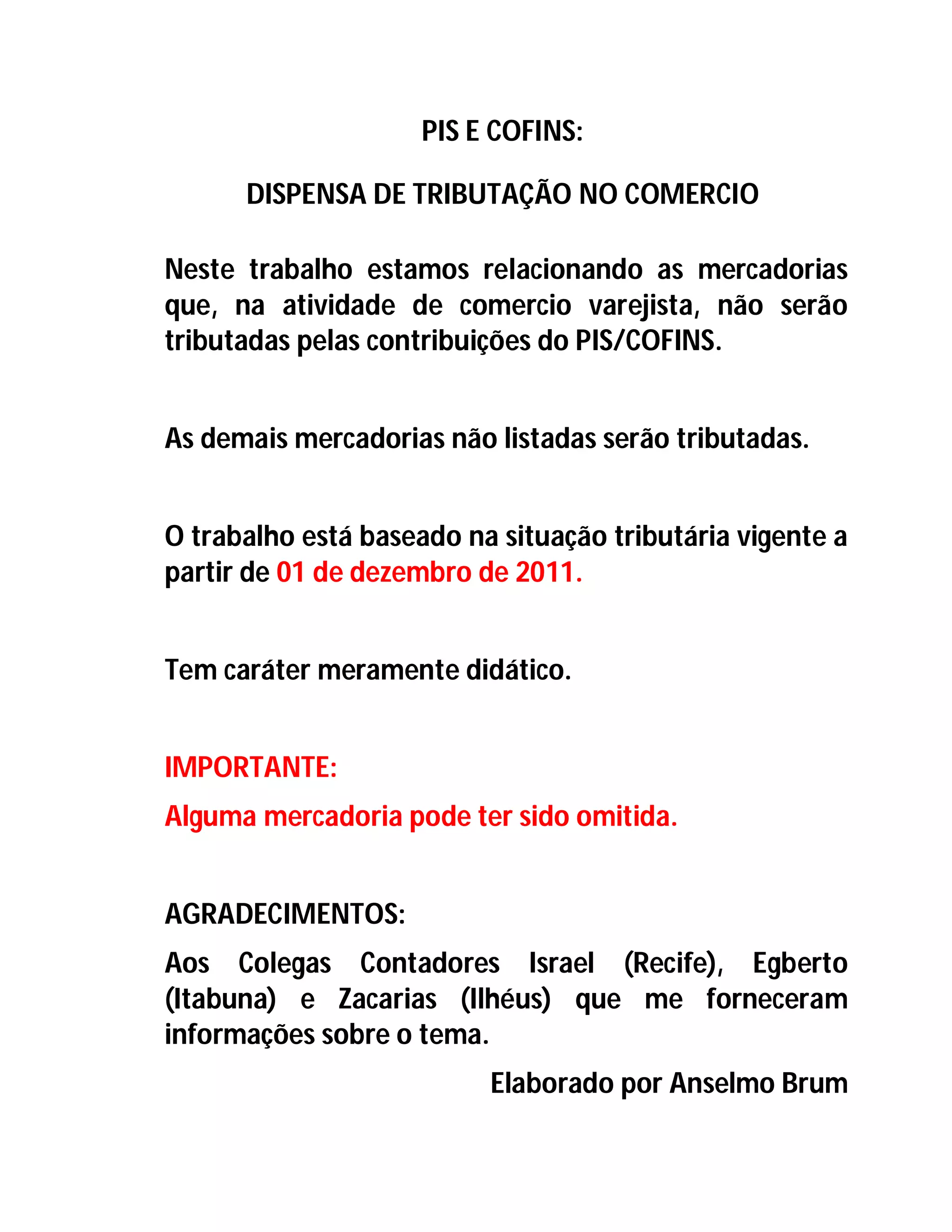 O documento aborda a dispensa de tributação do PIS e COFINS para mercadorias no comércio varejista a partir de 2011, listando as mercadorias isentas e suas respectivas classificações fiscais. Ele também menciona que alguns produtos podem não ter sido incluídos e que a informação é meramente didática. Diversas categorias de produtos, incluindo medicamentos e alimentos, são analisadas quanto à alíquota zero ou isenção tributária.