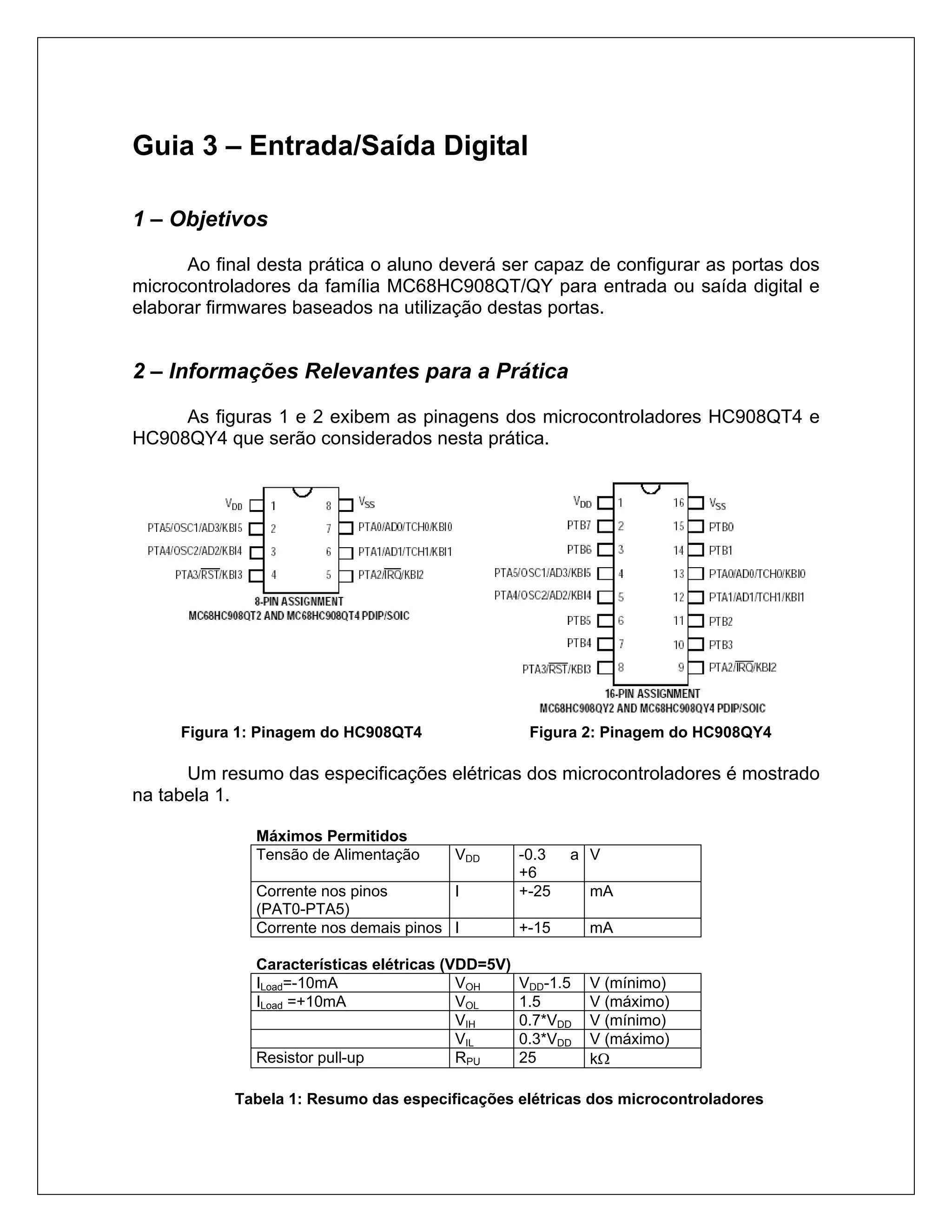O documento fornece instruções para configurar as portas de entrada e saída digitais de microcontroladores da família MC68HC908QT/QY. Detalha os registradores relacionados às portas, suas especificações elétricas e como acessá-los através de código. Fornece também dois exemplos de firmware para controlar hardware externo usando estas portas: 1) controlar LEDs e um botão; 2) implementar um semáforo com temporização de sinais.