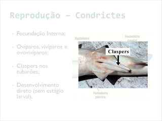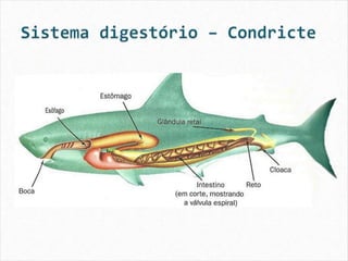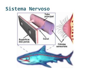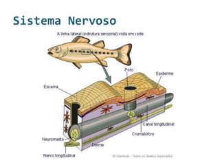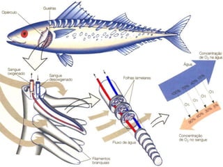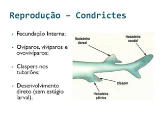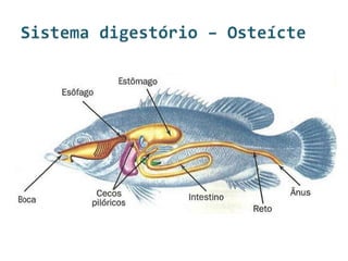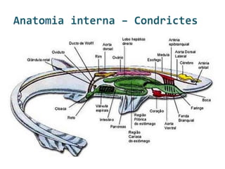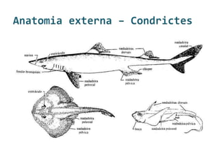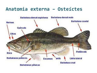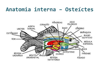 O documento descreve as principais características dos peixes, dividindo-os em dois grupos: condrictes, peixes cartilaginosos como tubarões, e osteíctes, peixes ósseos como salmões. Também apresenta as estruturas anatômicas como brânquias, bexiga natatória e opérculo que diferenciam esses dois grupos.