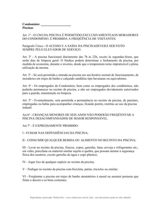 O documento descreve as regras para o uso da piscina em um condomínio, incluindo que o uso é permitido apenas para moradores e visitantes não são permitidos. Crianças menores de 6 anos precisam estar acompanhadas por um responsável na piscina. Há várias proibições como fumar, comer ou beber na área da piscina. Violações das regras podem resultar em advertências, multas ou suspensão do uso da piscina.