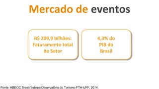 O documento aborda o setor de eventos no Brasil, destacando um faturamento de R$ 209,9 bilhões, representando 4,3% do PIB nacional. A comunicação em eventos é predominante em sites (84,4%) e redes sociais (66,5%), mas 92,1% dos eventos ainda não utilizam plataformas mobile. Apresenta também o Landerapp, uma plataforma para conectar organizadores e participantes de eventos, oferecendo funcionalidades para gestão e interação.