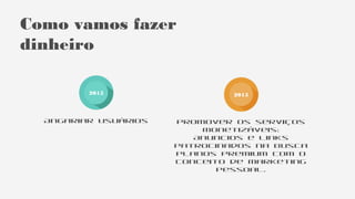 O documento apresenta uma proposta para uma rede social de negócios chamada Kard Share, que facilita a troca de cartões de visita virtuais entre profissionais e empresas. A plataforma visa resolver a carência de soluções de conexão eficiente em eventos e encontros, permitindo que usuários se promovam e conectem com outros profissionais. O modelo de negócios inclui monetização através de anúncios, planos premium e links patrocinados, com um foco em angariar usuários e fomentar interações na plataforma.