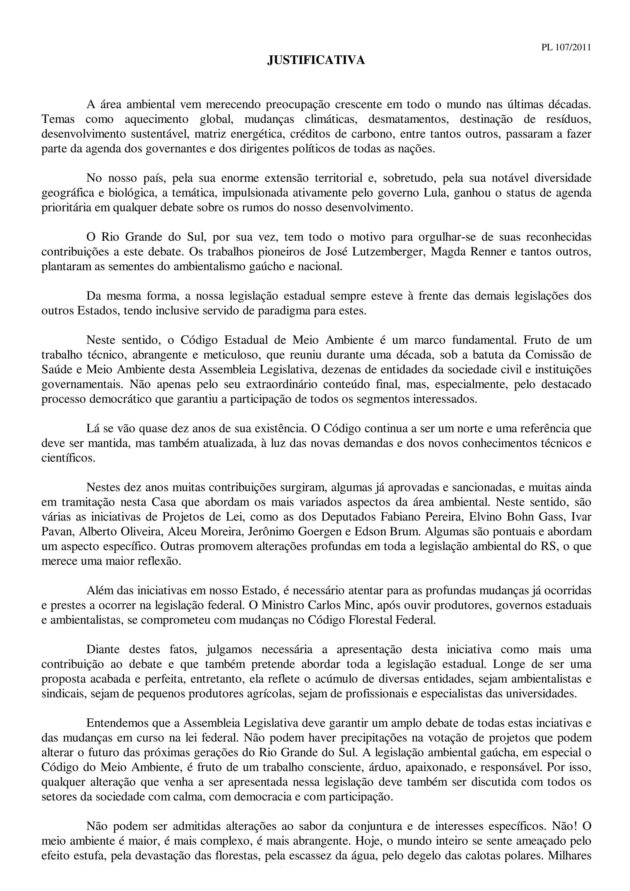 O documento discute a importância da legislação ambiental no Rio Grande do Sul e propõe atualizações ao Código Estadual do Meio Ambiente para refletir novos desafios e conhecimentos. Ele destaca contribuições pioneiras na área ambiental e a necessidade de amplo debate sobre qualquer alteração na legislação para garantir a participação democrática de todos os segmentos da sociedade.