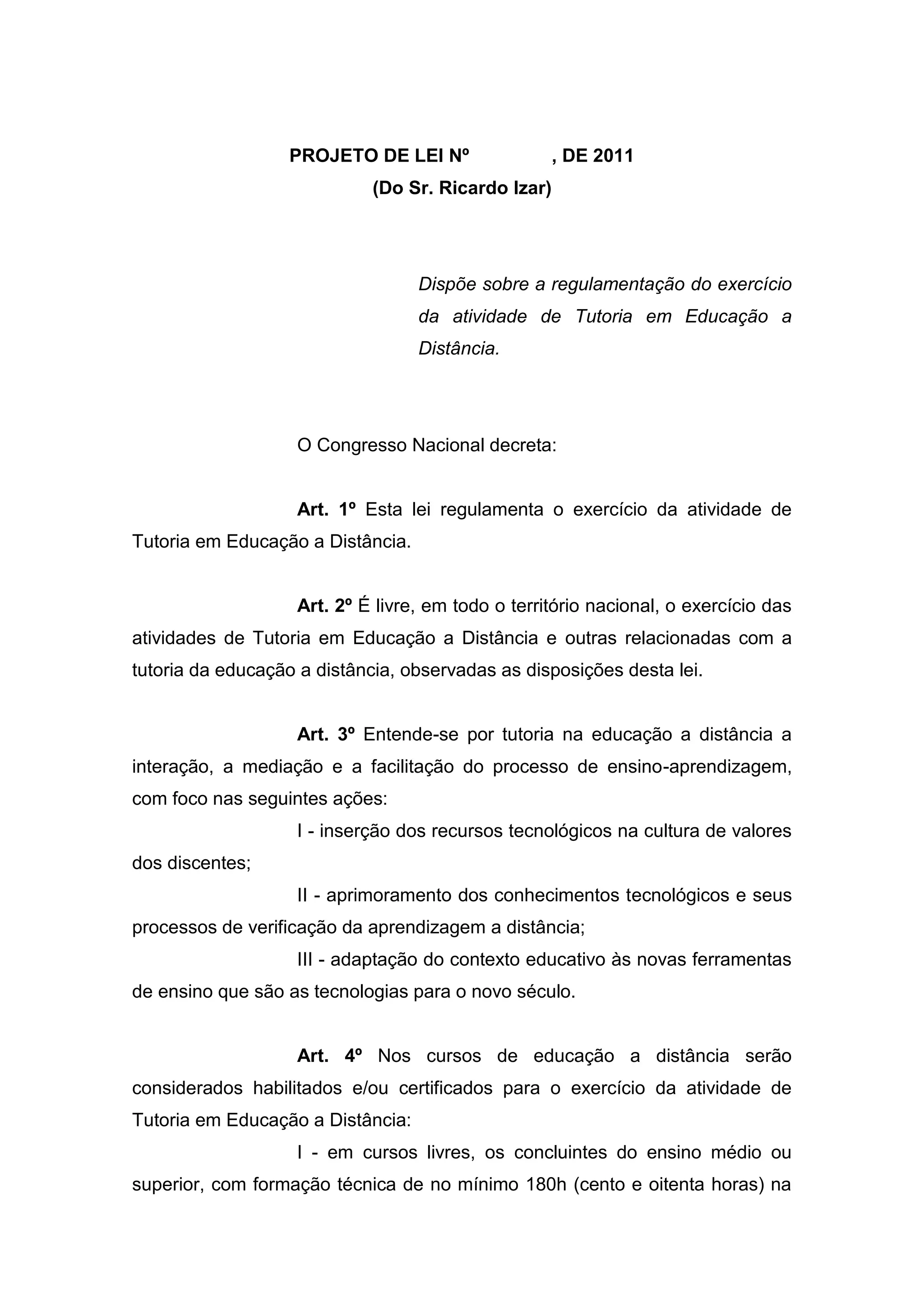 I. O documento propõe uma lei para regulamentar a atividade de tutoria na educação a distância.