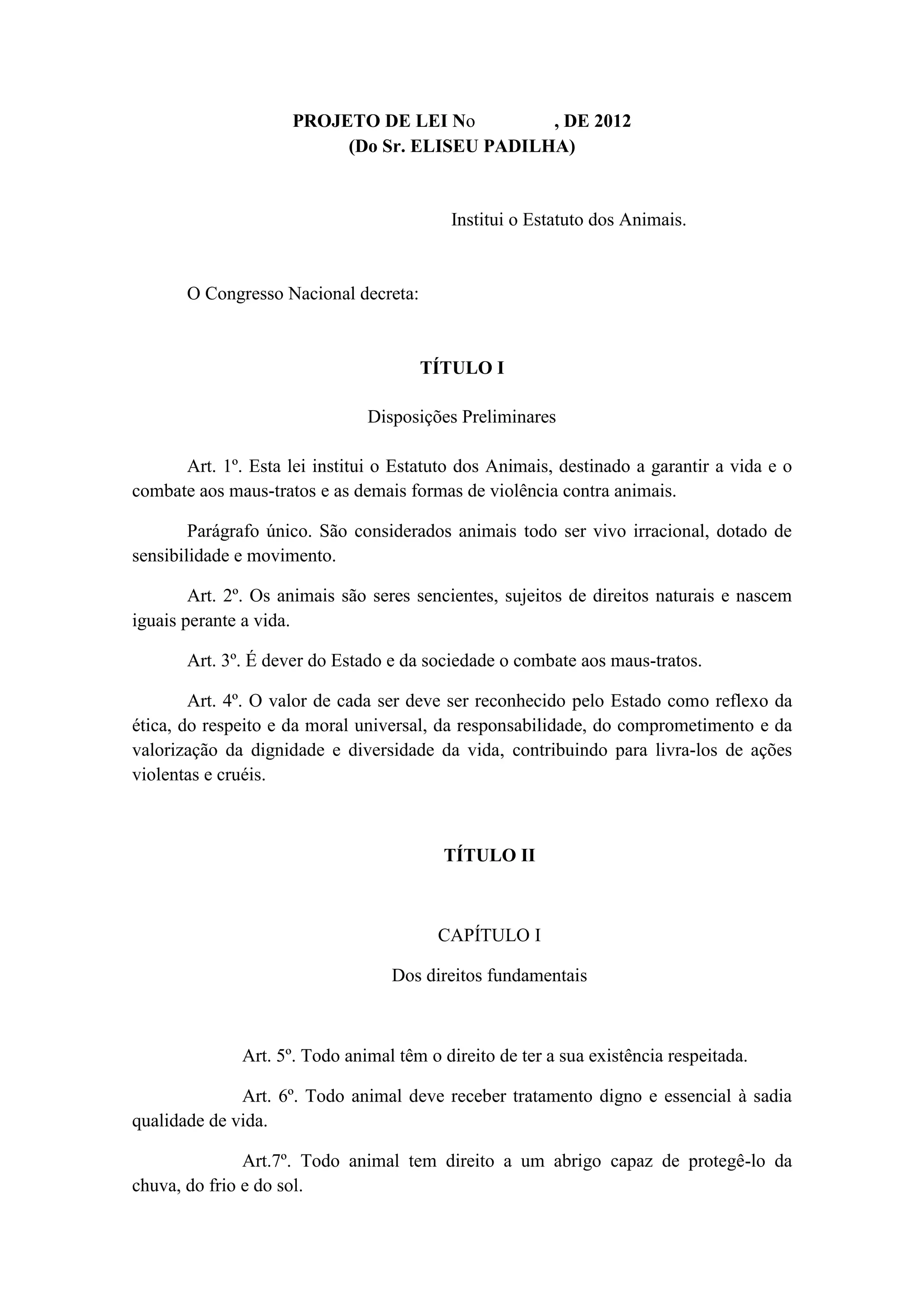 Este projeto de lei propõe o Estatuto dos Animais para garantir a vida e combater maus-tratos contra animais. Ele define animais como seres sencientes com direitos e deveres de proteção pelo Estado. O projeto estabelece direitos fundamentais dos animais, regras para transporte e controle de zoonoses, combate a maus-tratos e penas para infratores.