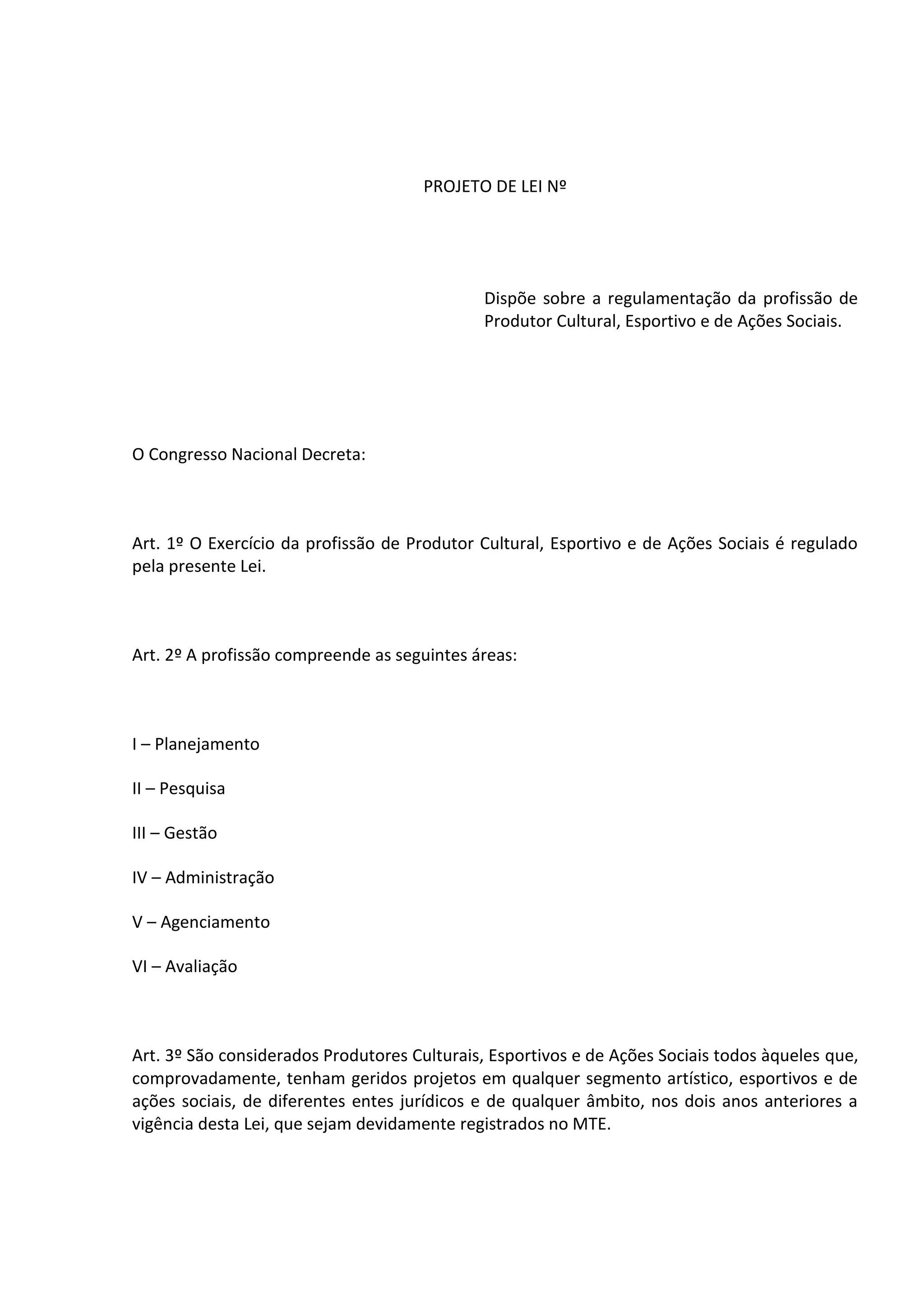 Este projeto de lei tem como objetivo regulamentar a profissão de Produtor Cultural, Esportivo e de Ações Sociais, definindo suas áreas de atuação e requisitos para obtenção de registro. O documento estabelece normas para o exercício regular da profissão e reconhecimento desses profissionais junto a agentes financiadores.