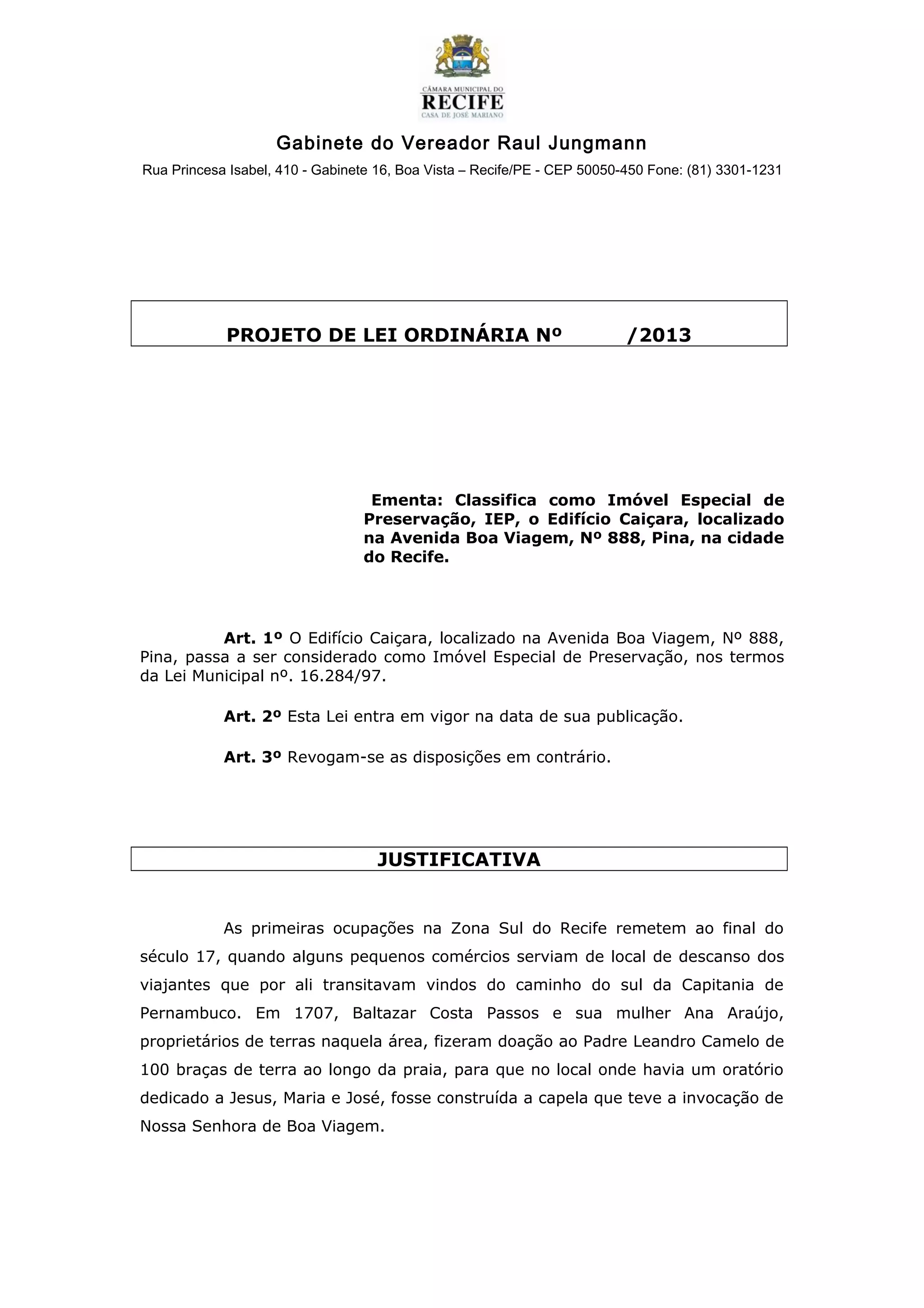 O projeto de lei classifica o Edifício Caiçara, localizado na Avenida Boa Viagem em Recife, como Imóvel Especial de Preservação. O edifício foi construído em 1942 em estilo neocolonial hispânico e é um dos poucos remanescentes da origem do bairro de Boa Viagem. Sua preservação é importante para a memória histórica e cultural da cidade.