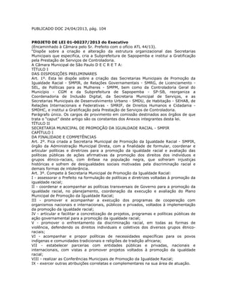 Este documento propõe a criação de novas secretarias municipais, incluindo a Secretaria Municipal de Promoção da Igualdade Racial (SMPIR). Ele define a estrutura e competências da SMPIR, que terá a missão de formular políticas públicas contra a discriminação racial e promover a igualdade de oportunidades. Também cria o Conselho Municipal de Igualdade Racial para assessorar a SMPIR.